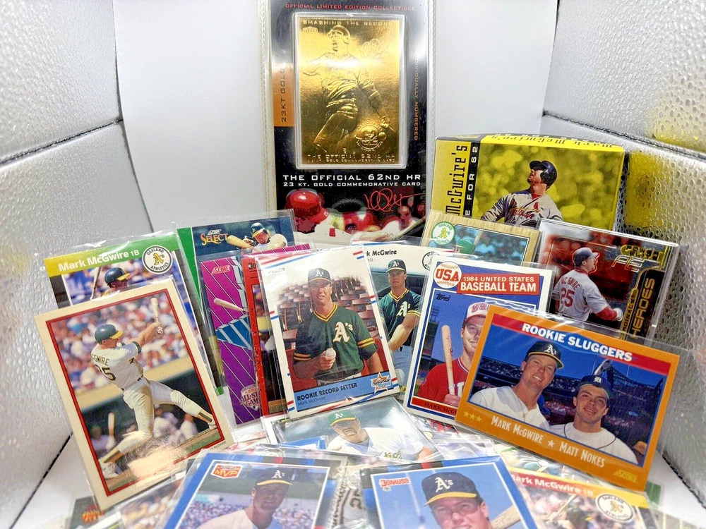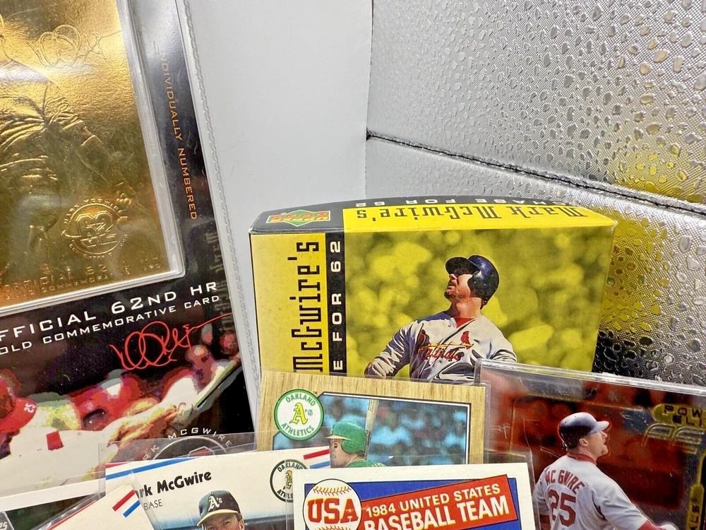 đ„ Dive into baseball history with this incredible Mark McGwire Fan Collection featuring rare, iconic cards from throughout McGwireâs legendary career. Whether youâre a die-hard fan or a collector, this set is the perfect treasure trove for your collection. What's Included: A variety of premium McGwire baseball cards from brands like Topps, Fleer, Pinnacle , and more. limited-edition 23kt Gold Card commemorating Mark McGwire's historic 62nd home run. Individually numbered and encased. Cards spanning McGwire's Aâs and Cardinals era , including highlights from his record-breaking 1998 season . A mix of glossy and traditional styles showcasing iconic moments of his career. Why This Collection? đ Collectorâs Dream: A unique opportunity to own a piece of baseball history. đ Perfect Gift: Ideal for the ultimate McGwire fan or anyone who appreciates the golden age of baseball. ⟠Diverse Selection: Features an array of designs, team uniforms, and career milestones. Add this incredible Mark McGwire collection to your lineup today and relive the excitement of one of baseball's most memorable players! đ„