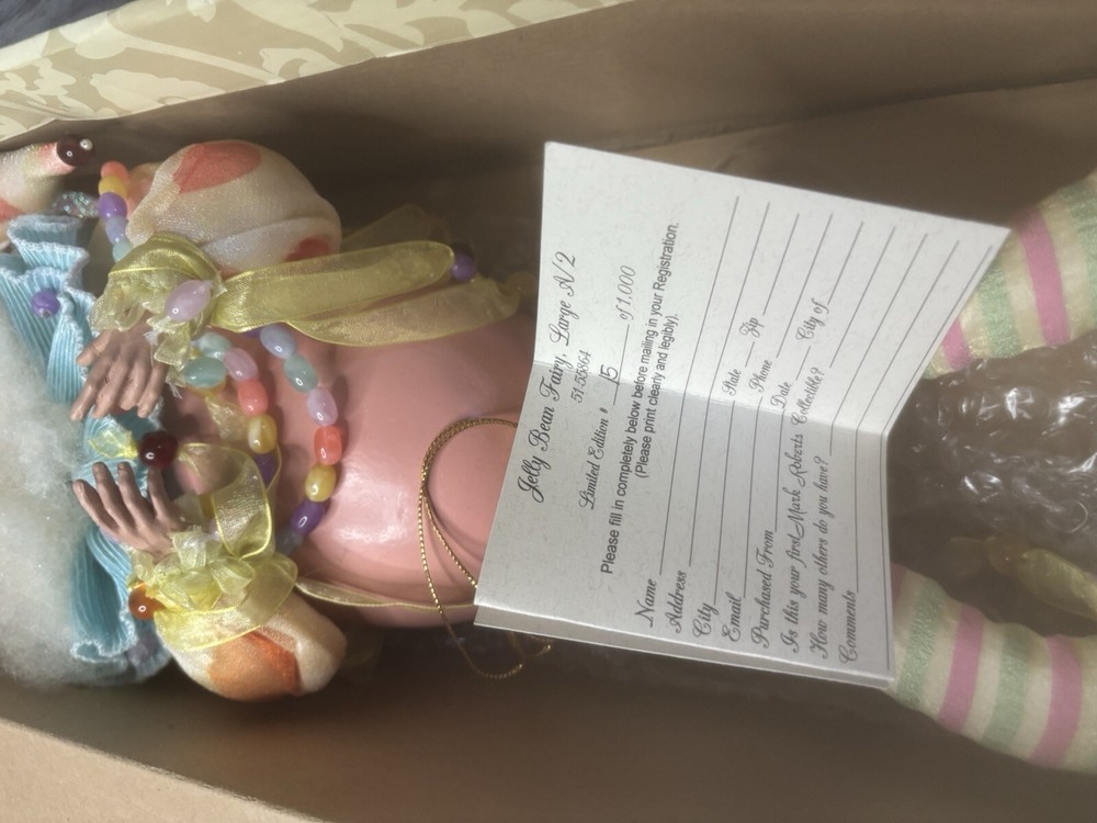 This adorable Jelly Bean Fairy is a true collector's gem! Still in its original box with just a tiny tear, the doll itself is flawless and includes the unfilled registration slip. Rare and beautifully crafted, it’s a must-have for any Mark Robert’s fan. Absolutely love it!
