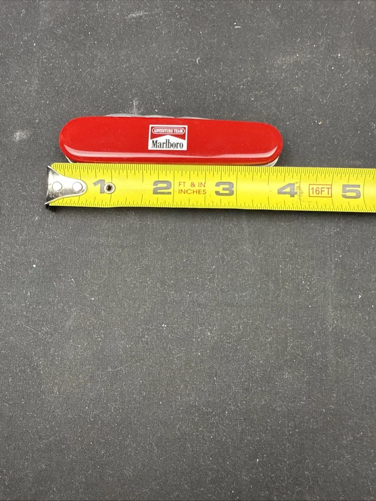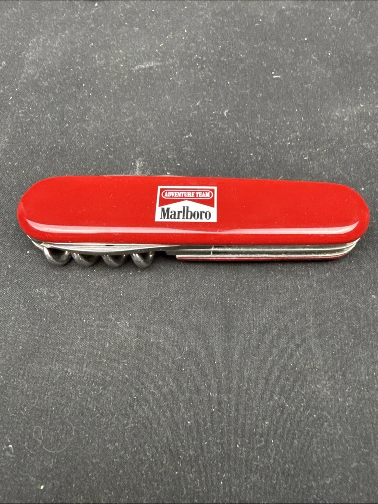The product is a Marlboro Adventure Team Swiss Army Victorinox Multi-Tool Pocket Fishing Knife. It features a stainless steel blade with a plain edge, ambidextrous dexterity, and a manual opening mechanism. The multi-tool includes tools such as a punch, screwdriver, bottle opener, and can opener, all neatly housed in a red plastic handle made by the prestigious brand Victorinox in Switzerland. This original and authentic collectible folding knife is a versatile and practical tool for various tasks.