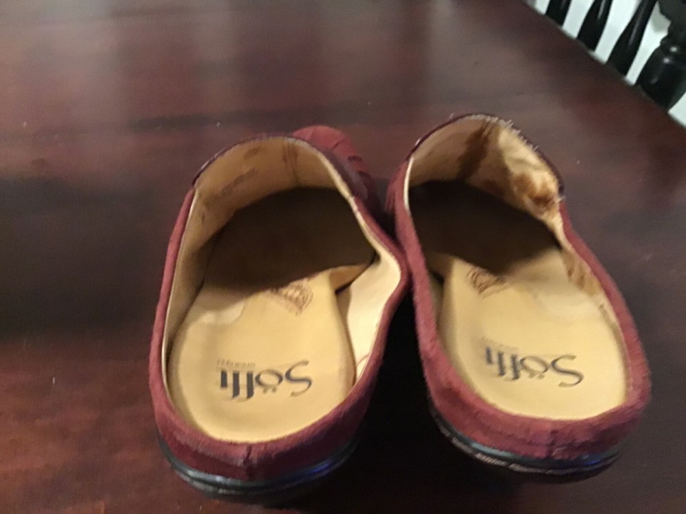 Step into effortless style with these maroon suede leather mule heels, perfect for adding a touch of elegance to any outfit. The slip-on design offers convenience while the embroidered accents provide a distinctive flair, making these shoes a versatile addition to your wardrobe. Crafted with comfort in mind, they feature a supportive wedge heel and are lined, insole, and outsole with premium leather. Available in size 8m, these shoes are a blend of contemporary design and timeless appeal, suitable for various occasions, from office wear to casual outings.