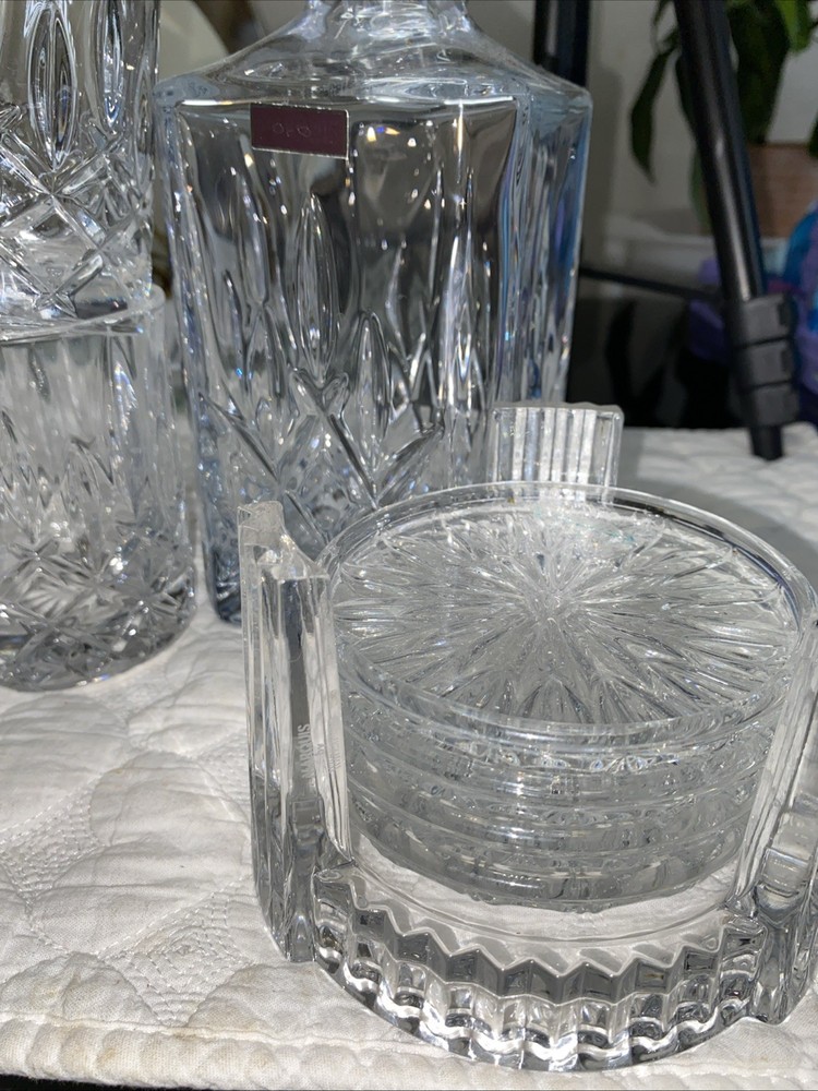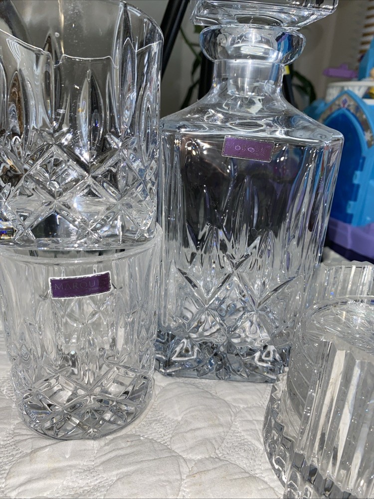 The Marquis Waterford Set of Crystal Glasses and Decanter Liquor Holder is a luxurious and elegant set perfect for all occasions. Made from high-quality crystal, the round-shaped pieces feature a glossy finish and are hand-blown for a sophisticated touch. The set includes a signed decanter with a drink-through lid and a set of cups, all in a clear color. With a vintage feel and production style of elegant glass, this original set from the 2000s exudes timeless charm and class for both unisex adults to enjoy. Hand wash only to maintain its beauty and sparkle.