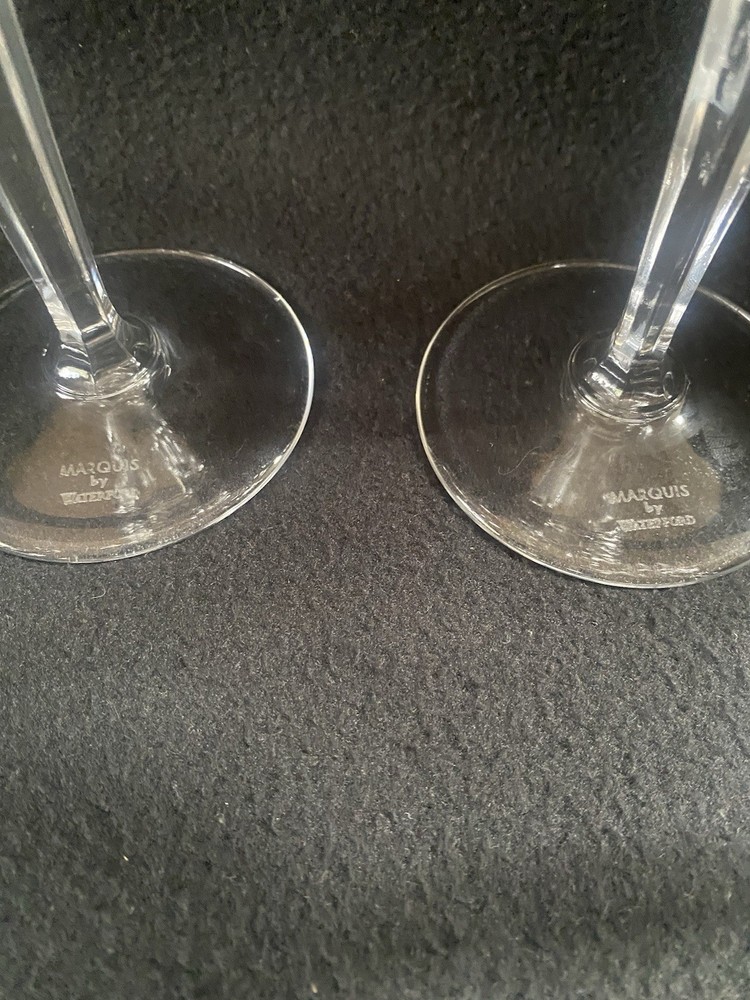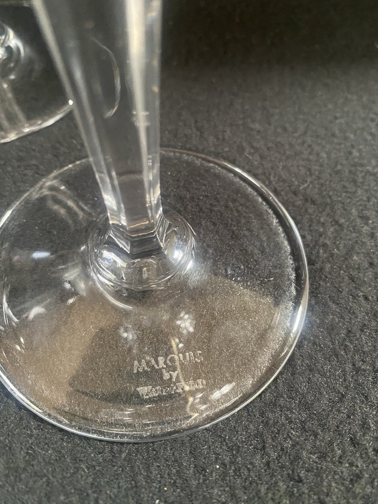 Elevate your drinking experience with these exquisite Marquis by Waterford crystal wine goblets. The set of four round goblets are hand blown in Italy and feature a stunning sparkle pattern, adding a touch of elegance to any occasion. Each goblet stands at 8 inches tall and is signed by the renowned Marquis by Waterford brand. Crafted with the finest materials and production techniques, these goblets are a must-have for any mid-century modern enthusiast. They are perfect for all occasions, whether it be a romantic dinner or a festive party. With an etched backstamp and original design, these goblets are a unique addition to any drinkware collection.