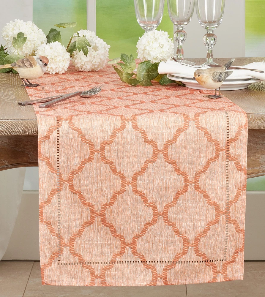 Complete your table decor with this unique, Moroccan style runner that provides a discrete background for the table setting. Its versatile and modern style is just what you need for a coordinated look. Perfect for multiple occasions, the Hemstitch Laser-Cut Table Runner can be paired with different types of dinnerware. Size: 16"x90" Design is not reversible Runner has no lining Polyester is a low textile loved for being easy care Material: 100% polyester + Care: cool machine wash, dry clean recommended, cool iron