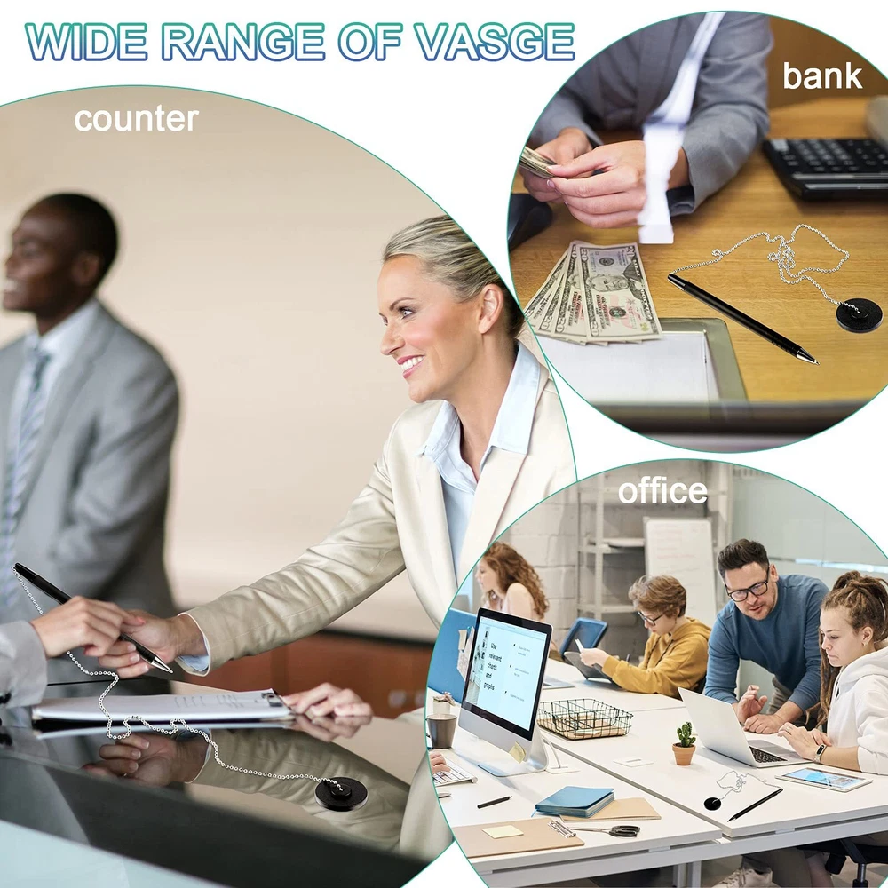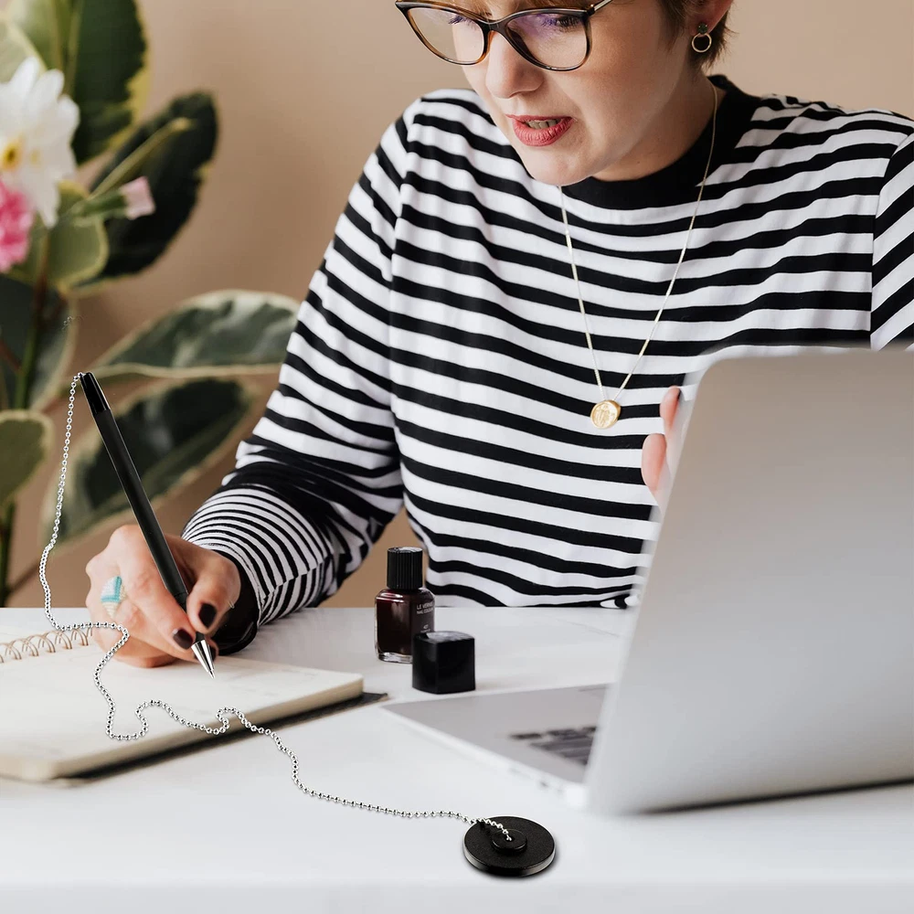 Features: Classic black ink can be applied to writing most documents with long-lasting, safe and reliable, with good texture, the ink able to dry quickly, and you'll love to hold the pens as they touch comfortably in your hand. These security pens are easy to refill with black ink when the ink runs out, and the pens come with reliable, quality black ink that dries quickly. You and people around you can use these pens at ease. Specifications: Material: metal Color: black Sizes: Secure pen: 5.8 inches in length Refill: 5.3 inches in length Pen safety chain: 23 inches in length Package includes: 6 x Secure pens 12 x Pen refills Notes: Manual measurement, please allow slight errors in size. The color may exist slight difference due to different screen displays. Complete set: the package comes with 6 pieces of secure pens with pen chains and security pen holders, also includes 12 pieces blank ink refills, a chain and a pen holder for each pen, a total of 18 pieces; The quantity is enough and convenient for your daily study or work needs Quick to dry black ink: the classic black ink of these pens with chains is long-lasting, safe for human body, with nice texture and can dry quickly, so you can use them to writ most documents, such as composition, notes, diaries, etc.; In addition, these black safety pens are comfortable to hold and write, making you fall in love with writing Make the work go smoothly: the secure pens with chains can stay fixed and standing, just reach out your hand and quickly pick it to use at anytime and and anywhere, making your workday smoother; It may be a little inconvenience but losing your pen several times a day may to a bad mood; These security pens will make the day run smoothly Chain size: the pen safety chain can extend to 23 inches, long enough to fit on most desk tops; The round black pen holders can stick firmly to smooth surfaces and won't come off easily, so you can use them with confidence Wide applications: the counter pens with chains are suitable for office, study, reception desk, hospital, school, bank or other occasions of daily use, etc.; Thanks to the strong adhesive holders, these pens will stick to the counters and will not move; These pens can be shared with everyone, but they will stay with you forever