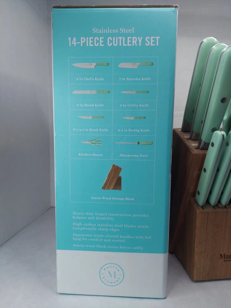 Martha Stewart Ergonomic Stainless Steel 14 Pc Wood Block Cutlery Knife Set In color "Martha Blue" WHAT'S IN THE BOX: One 8-inch chef's knife, one 7-inch santoku knife, one 8-inch bread knife, one 5-inch utility knife, one 3.5-inch paring knife, six 4.5-inch steak knives, one pair of kitchen shears, one sharpening steel, and one acacia wood block HIGH CARBON BLADES: Forged stainless steel knives with full tang construction for balance and durability ERGONOMIC HANDLES: Triple-riveted handles in Martha's signature shade of blue STURDY KNIFE BLOCK: Acacia wood knife block stores knives safely Open Box never used.