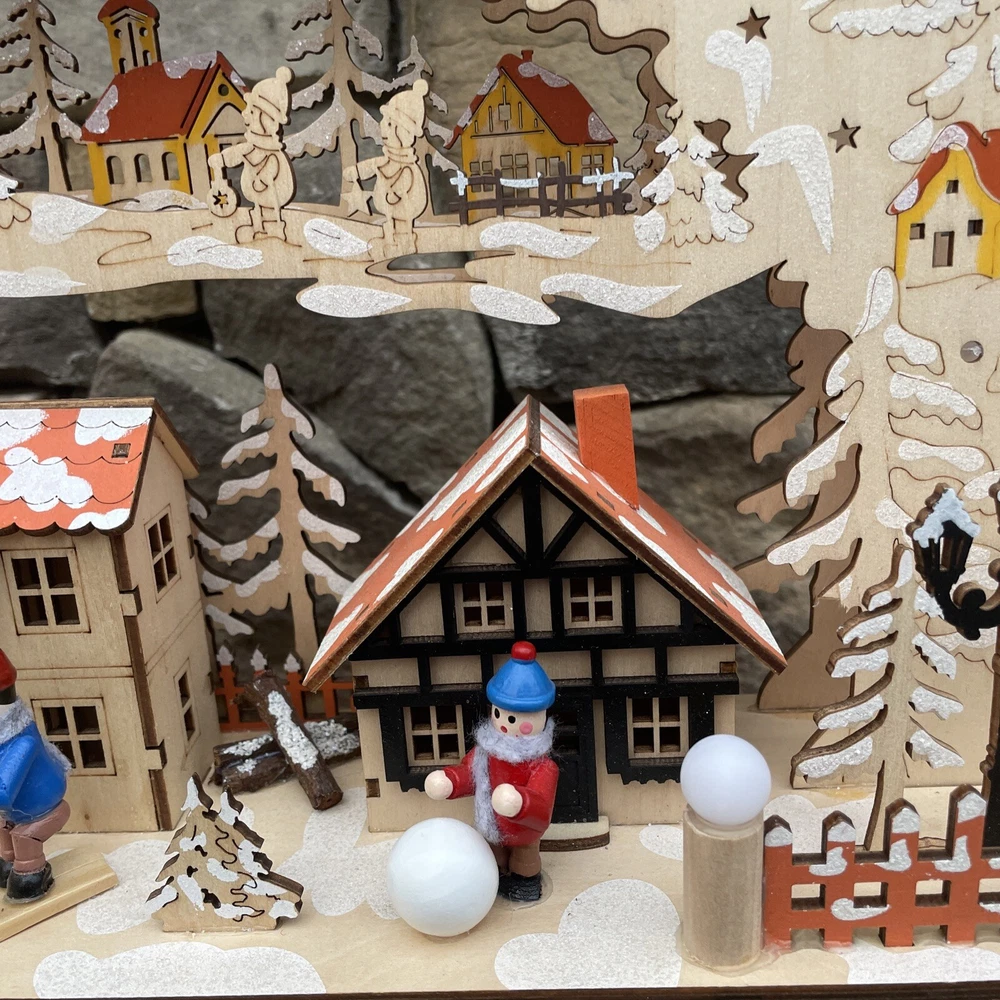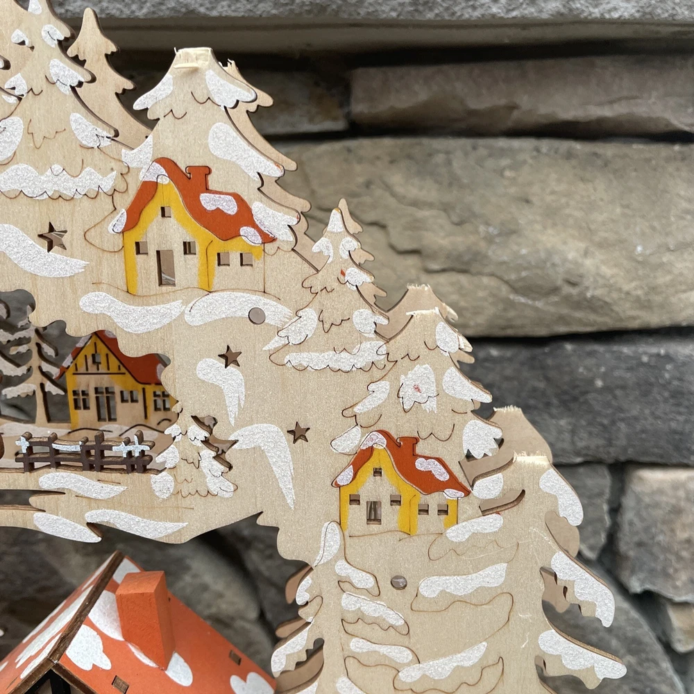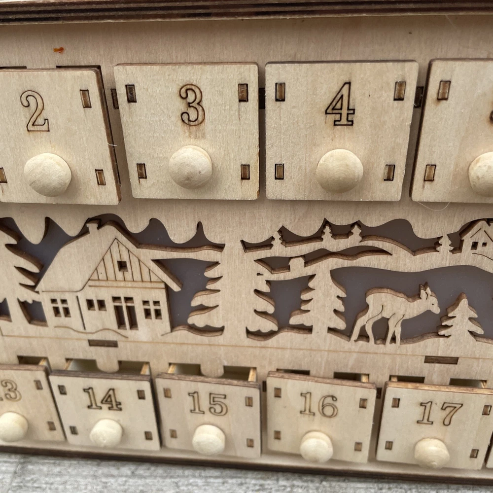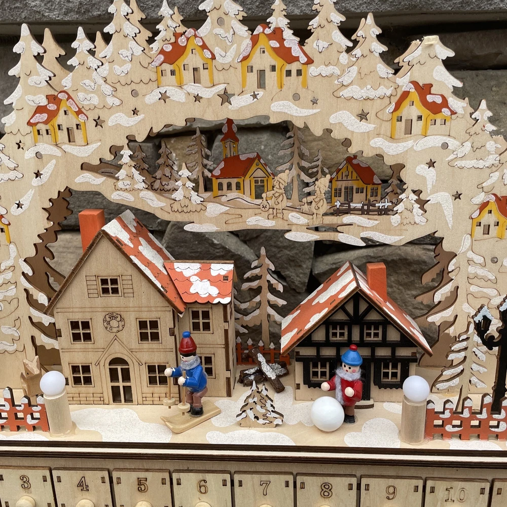 This festive Martha Steward Adventure calendar has led lights and has a lot going on. Please be aware and see pics as there are a few tree tips missing, otherwise a beautiful piece. The kidos will love it! Has led lights and takes 2?AA which are not included. You’ll love the details on this piece