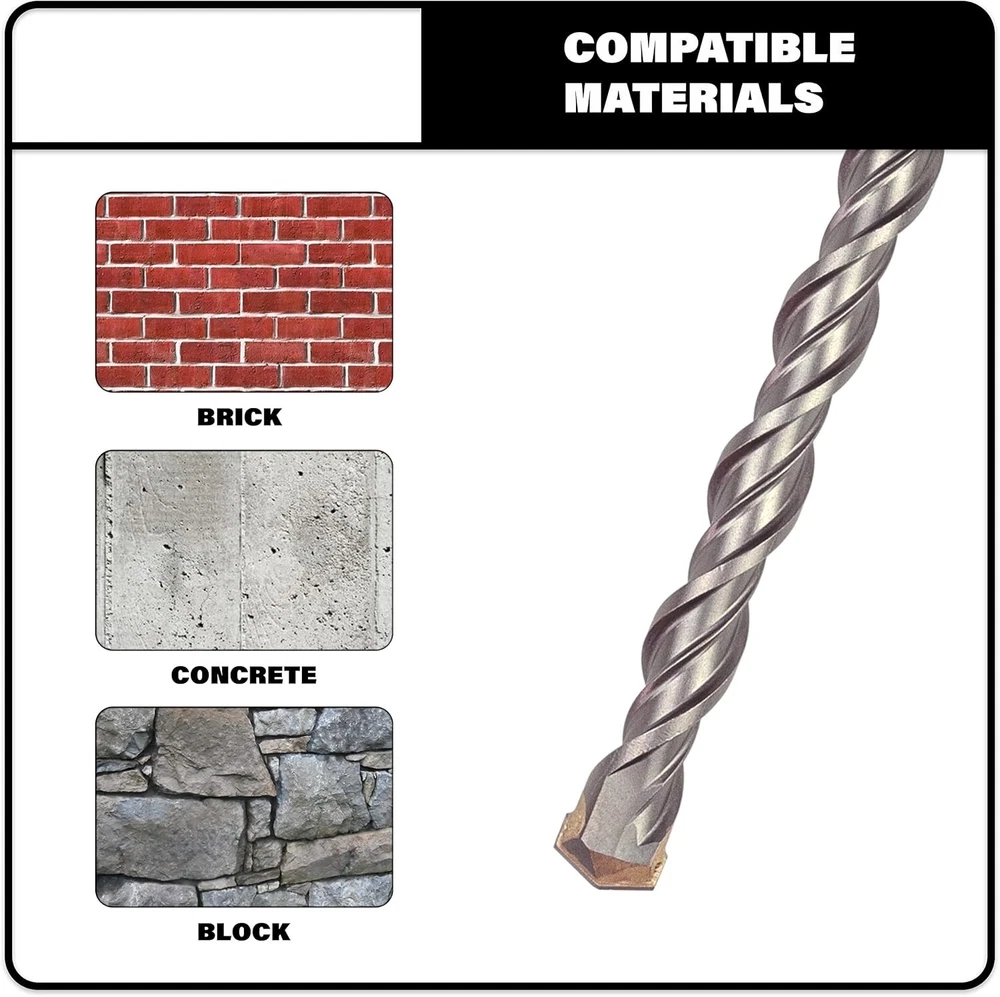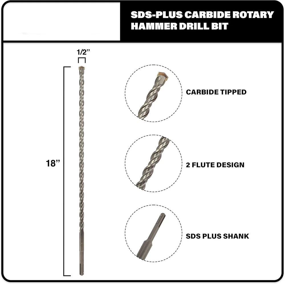 Martillo Giratorio Con Punta Sds-Plus De Carburo Sds De Bit Brote De 1/2'' NUEVO Broca SDS Plus de 1/2" x 16" x 18" – broca larga para taladro percutor de mampostería Broca SDS de alta calidad diseñada para trabajar en aplicaciones de mampostería; ladrillo, piedra, hormigón, bloque, etc. Compatible con todos los taladros percutores rotativos de tamaño SDS Plus; Bosch, DeWalt, Hitachi, Hilti, Makita, Milwaukee, etc. La broca para taladro percutor SDS cuenta con una punta de carburo autocentrante de 2 ranuras que garantiza velocidades de corte rápidas y una vida útil MÁXIMA Vida útil prolongada: nuestro diseño optimizado de brocas para hormigón permite que el material salga rápidamente del orificio mientras permite que la broca para taladro percutor de hormigón permanezca fría