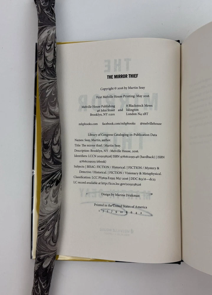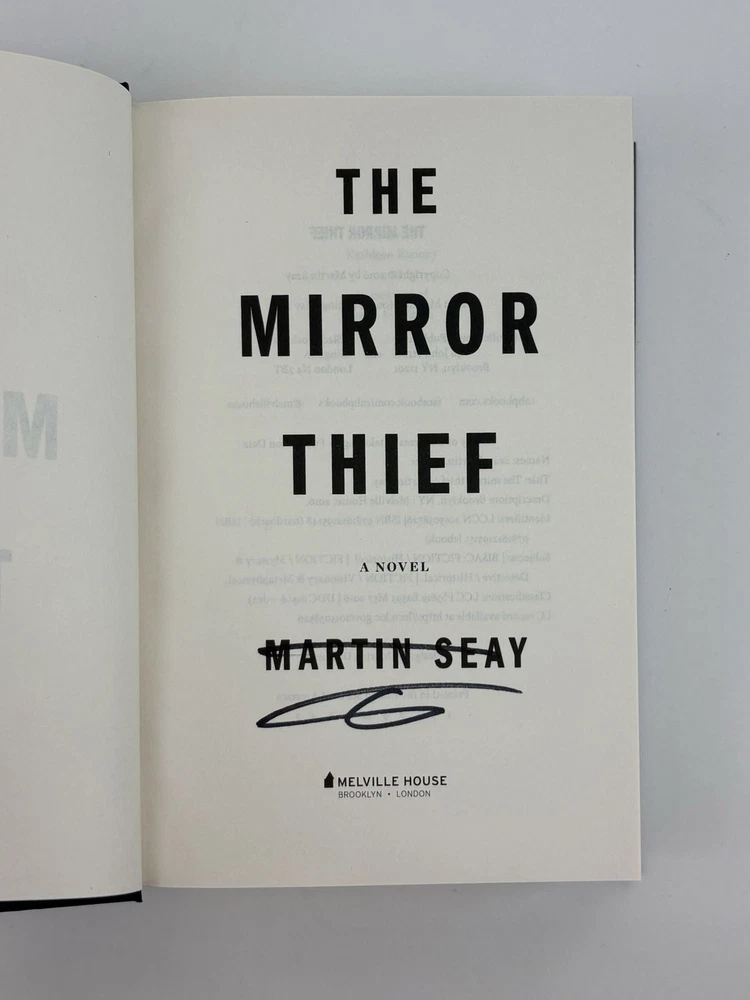 THE MIRROR THIEF [Signed] Author: Seay, Martin Title: THE MIRROR THIEF [Signed] Publication: New York, New York & London, UK: Melville House, 2016 Edition: First Edition, First Printing Description: Octavo, 582 pages. In Very Good condition with Near Fine condition dust jacket. Spine is navy with glass shard pattern and yellow lettering. Dust jacket protected by mylar covering, price uncut: "$27.95" on front flap. Boards have mild shelving wear along extremities. Mild scuffing along tail edge of text block, pp.73-80, 437-458. Signed flat on title page by Martin Seay. Shelved in hallway. Seller ID: 1391789 Subject: Literature Welcome to the eBay store of Second Story Books! DC's Oldest Rare and Used Bookstore, Second Story Books operates two open shops in the Washington D.C. metropolitan area. We have an extensive internet presence and provide accredited appraisals member ASA. This listing was created by Bibliopolis.