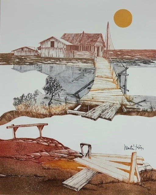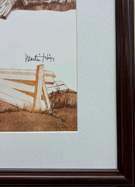 Martin Tobias "Across the bridge" Experience the tranquil essence of rural landscapes with Martin Tobias's "Across the Bridge" an exquisite offset lithograph that captures the sublime beauty of farming life. This piece artfully portrays a serene barn set against the majestic backdrop of mountains, sunrise/sunset, offering a glimpse into the idyllic charm of countryside existence. It is a thoughtfully crafted piece for those who appreciate the peaceful panorama of nature as seen through the eyes of a master artist. This piece is ready to adorn your space with its visual story of life in the valleys and by the brooks. This artwork is: - New - Hand Signed - Custom Framed in a gold and brown wood frame - Matted in gray - Framed Size: 22" x 26" - Image Size: 15" x 19" - Complete with ready to hang hardware installed - Interested in different framing? Contact us! Martin Tobias, a talented fine artist works in a variety of media. From a background as a graphic deisgner, his prints depict his professional artistic interpretation that captures the eye and mind of the viewer. Whether a historic landmark, rural landscape, rugged beach, quaint harbor or picturesque village, his unique sense of space and color is always present as a major part of his work. Tobias was born in 1932 and raised in New York City. From his early childhood, “Marty” has always enjoyed drawing and painting and interpreting what he has seen onto paper or canvas. He was determined to be an artist from those early years on. He was accepted to The High School of Music & Art and earned a scholarship to the prestigious Cooper Union Fine Art School in New York City where he received a BFA after service with the U.S. Army in Germany. After returning to NY, he continued his art studies at The Art Students League and took classes with Bauhaus Abstractionist, Hans Hoffman, in Greenwich Village. He put all his studies to good use commercially and sharpened his skills through ten years of top-level artwork on Madison Avenue. As an independent Art Director, he created promotional material for leading advertising agencies and magazines, including Life , Esquire , Seventeen , and Bristol/Meyers. His background encompassed such projects as slide presentations, sales literature, corporate logos, book cover designs, and storyboards for commercials. The search for a more tranquil lifestyle eventually led Tobias to settle in Riverside, CA, where he worked as Art Director for Bourns, Inc., a large electronics manufacturer.