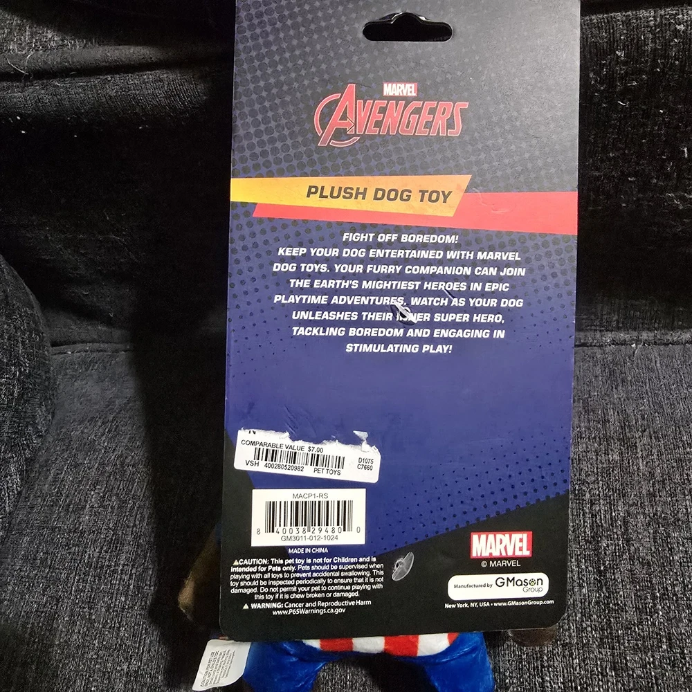 Type:Plush/SquekyModel:ToyFeatures:Squeaky, Captain AmericaUPC:Does not applyBrand:Marvelgtin13:Does not applyDog Size:8inchMaterial:PlushCountry/Region of Manufacture:China