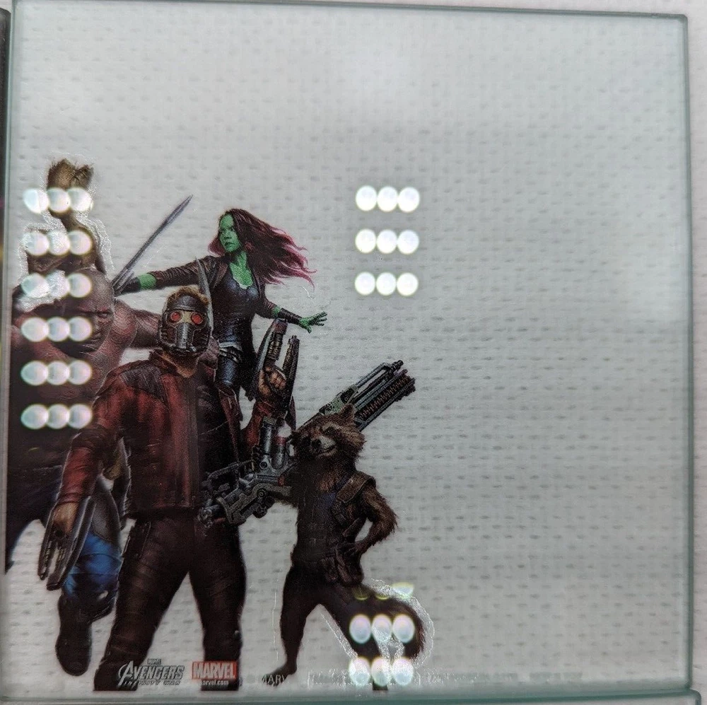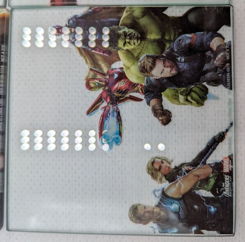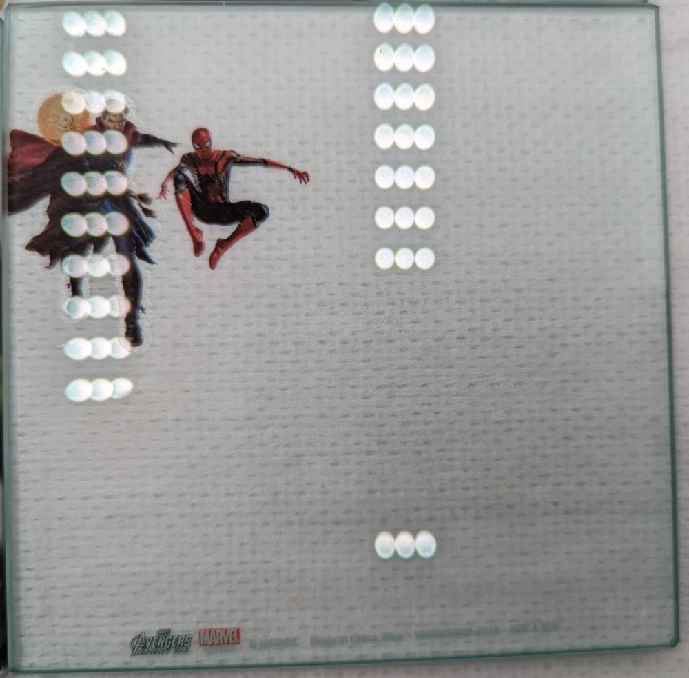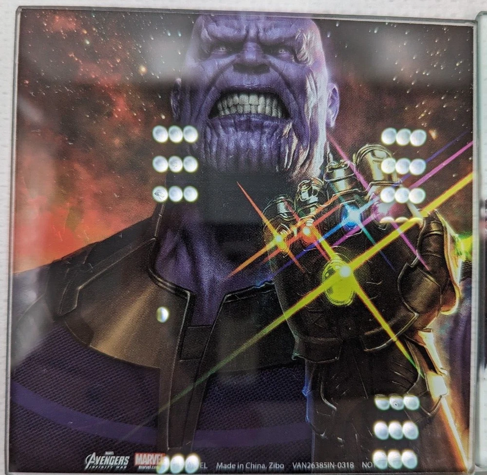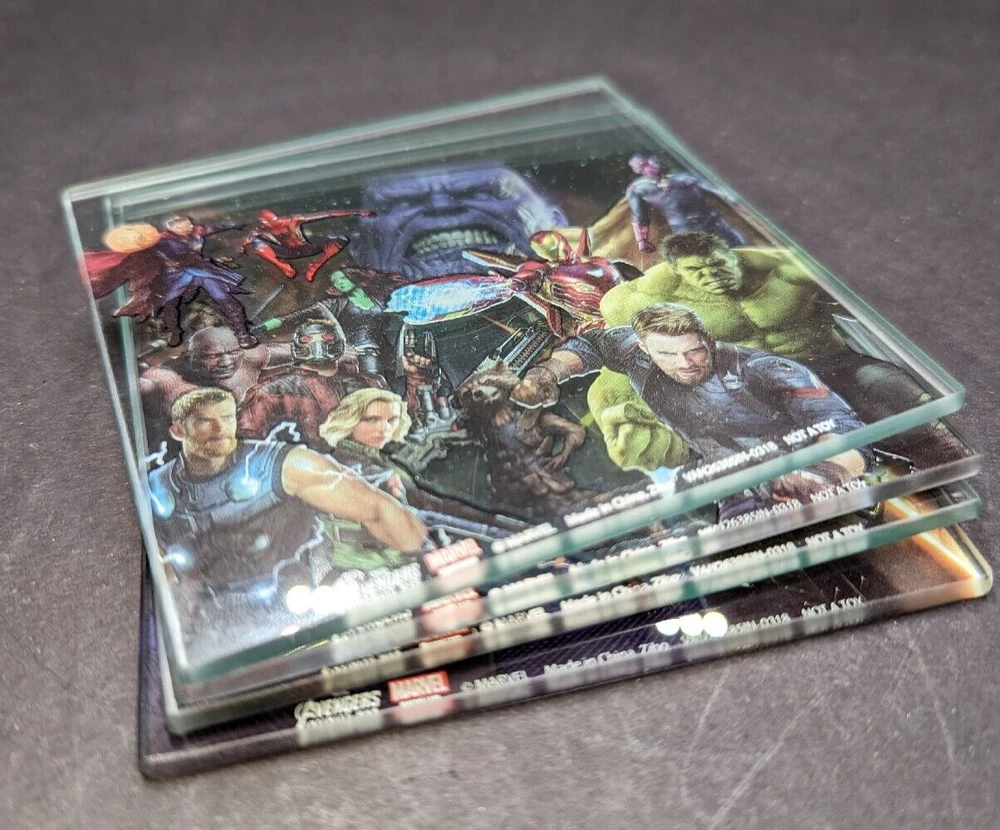 Marvel Comics Avengers Infinity War Thanos 4-Pc Stacking Glass Coaster Set. No chips or cracks. There are a few small superficial scratches on a couple of the coasters but nothing distracting or very noticeable.