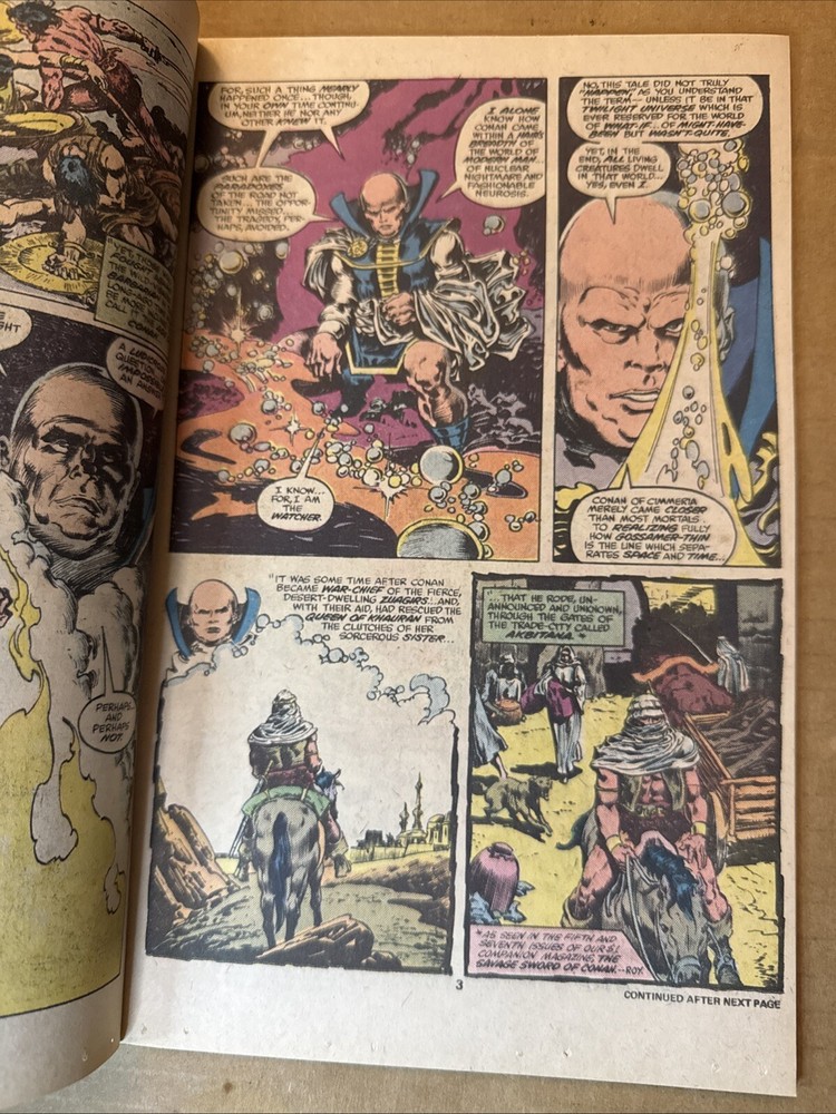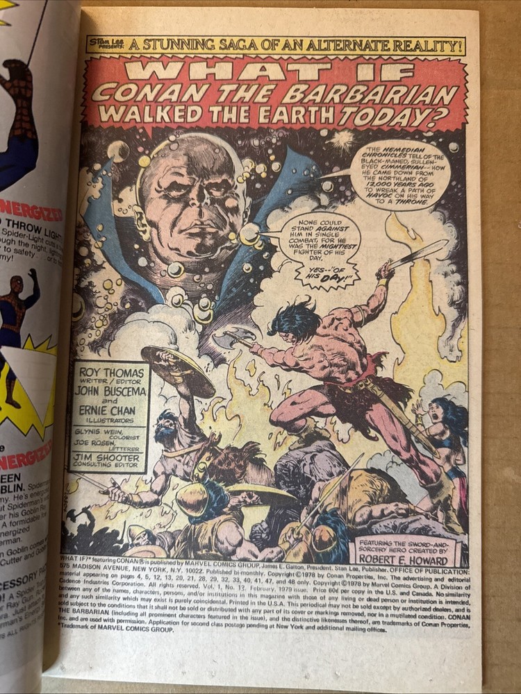 Dive into the Bronze Age of comics with "What If #13," a classic piece from Marvel Comics, published in 1979. Featuring the mighty warrior Conan the Barbarian, this single issue comic book poses a thrilling question: "What if Conan The Barbarian Walked The Earth Today?" The story, crafted by the renowned Roy Thomas, is a must-read for fans of action, adventure, and superhero narratives. As a first printing collectible, this comic book is a gem for both new enthusiasts and seasoned collectors. It showcases the vibrant artistry that has become a hallmark of US Comics tradition. The issue is graded at a 7.0 Fine/Very Fine, indicating its well-preserved state, and it comes boarded for added protection. A vintage treasure from the Marvel Universe, it's an essential piece to own for those captivated by the escapades of one of fantasy's most iconic characters.