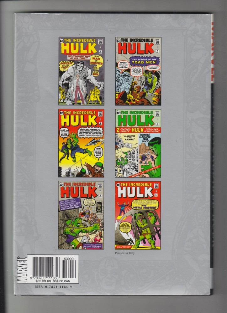 MARVEL MASTERWORKS VOL 1 INCREDIBLE HULK #1-6 HARDCOVER OUT OF PRINT U.S. shipping is $10.95. Overseas bidders, please use the Ebay shipping calculator to determine postage costs. International buyers are responsible for all customs and/or taxes, as it will be declared at the hammer price, and the item will not be declared as a gift. We have been a trusted name in the comics & collectibles field for over 35 years. We carefully grade each item, and ensure that it is complete, original, and authentic. We ship all of our items within one business day, and pack it professionally and securely. Hopefully you will find our descriptions accurate, and are thrilled with your item when it arrives. If you have any questions about your item (before or after it arrives), please feel free to contact us. Our customer service department will do everything possible to make you a happy customer! Beautiful copy!