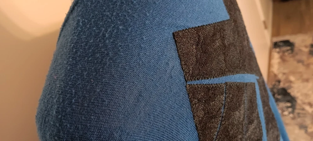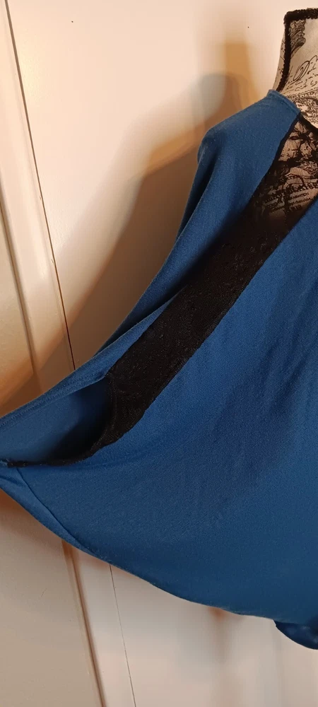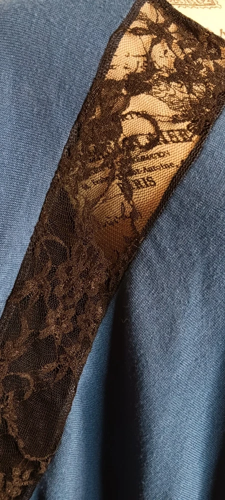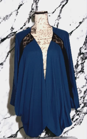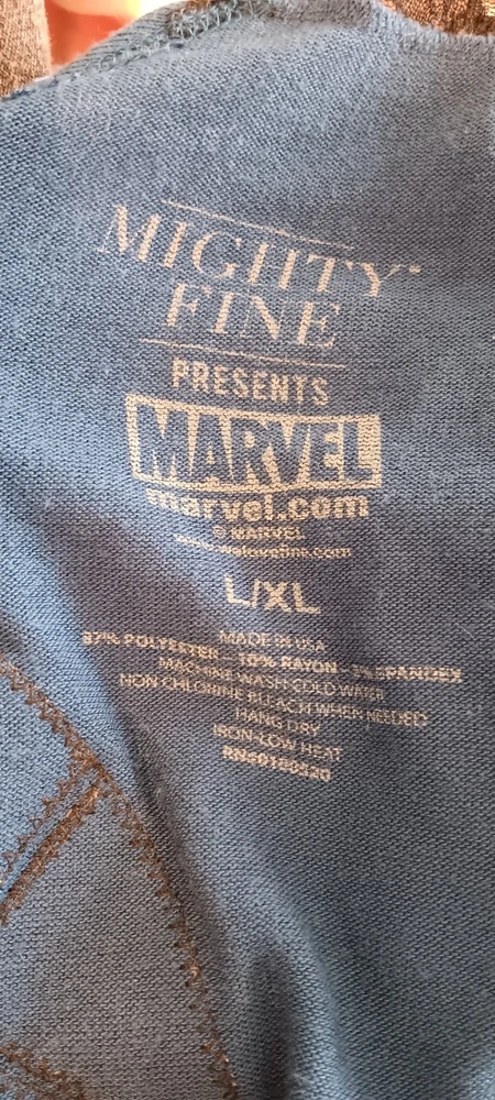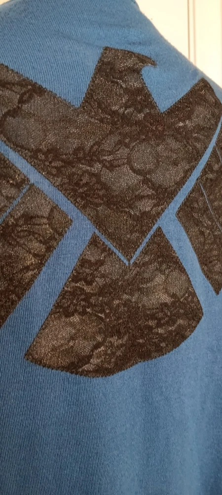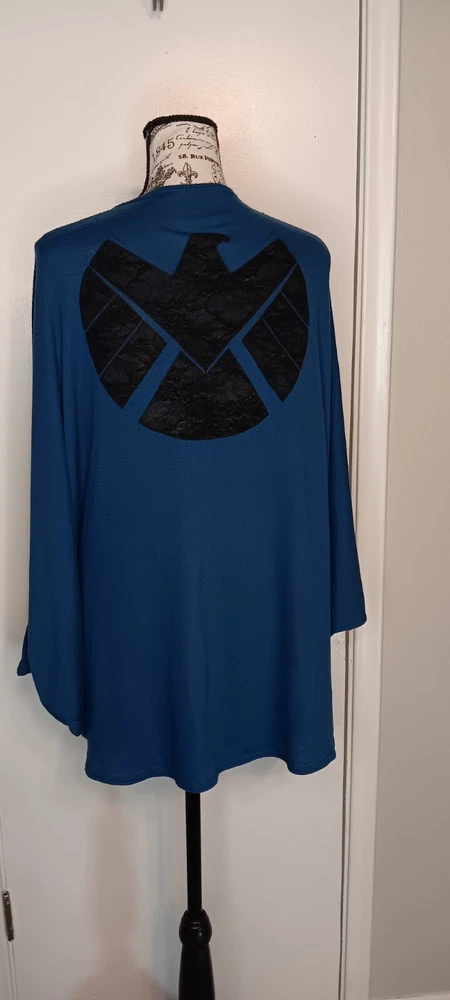 This women's Marvel cardigan is a size L/XL and has black lace accents on the sleeve and the Avenger's eagle logo in lace on the back. The sweater is a dark gray blue. It does have some pilling. It is 32" from the top seam of the shoulder to the bottom hem. The sleeves are a lagenlook type of sleeve; capped. Please see all photographs as they are part of the description. Shipped with USPS Ground Mail.