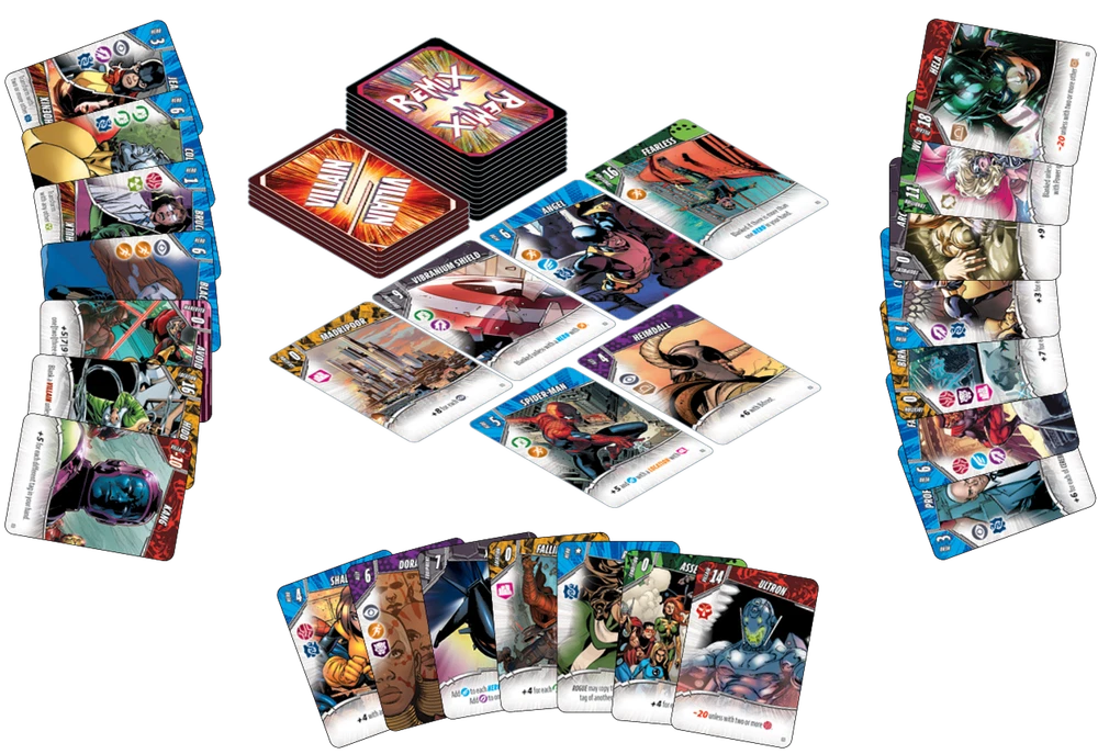 Wizkids/Neca Marvel Remix Players: 2-6 Playtime: 20 Age: 12+ Designer: Bruce Glassco Publishers: WizKids (I) Mechanics: Open Drafting, Set Collection Category: Card Game Create an epic battle with a hand of cards in Marvel: Remix, based on the acclaimed hit game Fantasy Realms! Marvel: Remix is based on the critically--acclaimed game Fantasy Realms, also by Bruce Glassco, which was nominated for the 2021 Kennerspiel des Jahres! Through Marvel: Remix’s intuitive gameplay, you’ll build a team of iconic heroes and allies, arm them with powerful equipment and maneuvers, and visit familiar locations, all while taking on infamous villains! Players are dealt a hand of seven cards representing characters, items, or places from throughout the Marvel Universe. Each turn, you’ll draw from the Hero deck, the Villain deck, or the cards discarded by your opponents, before discarding a card yourself. Cards have a base value, and a bonus that changes based on the other cards in your hand. Whoever has the hand worth the most points at the end of the game is the winner! - Collect iconic heroes, villains, and more! - Discover epic combinations! - Create the most powerful hand of cards! - Get ready for an epic Super Hero Battle! Contains: 61 Remix Cards 18 Villain Cards 1 Score Pad 1 Rulebook