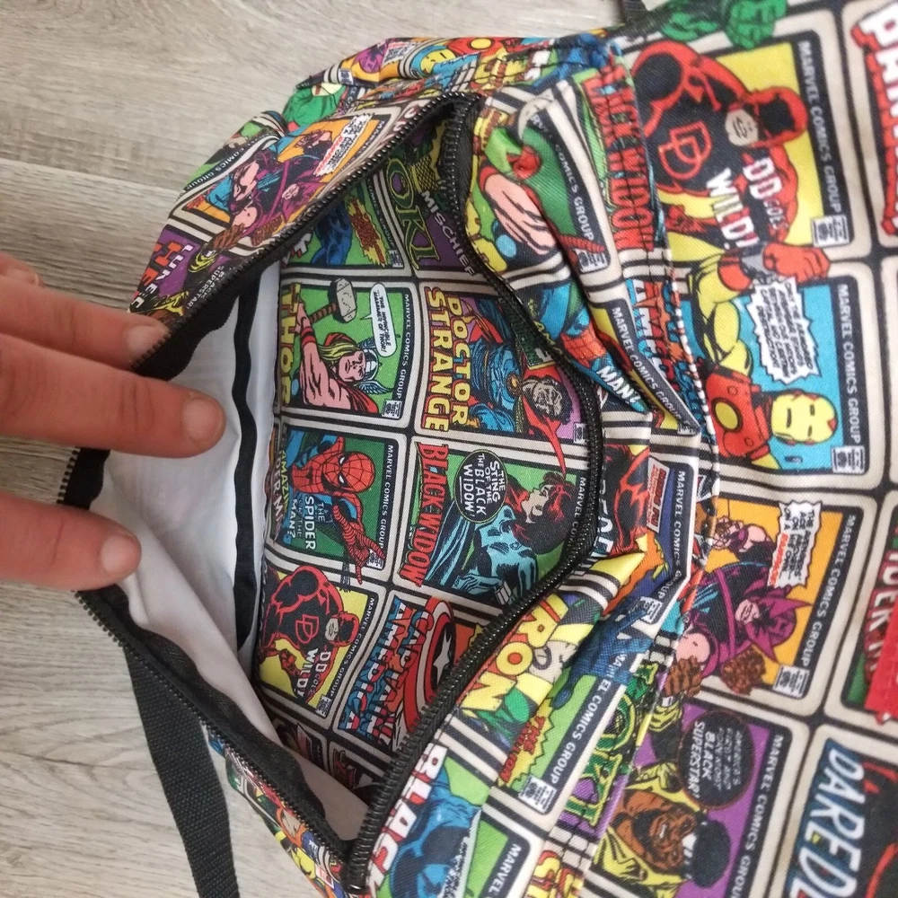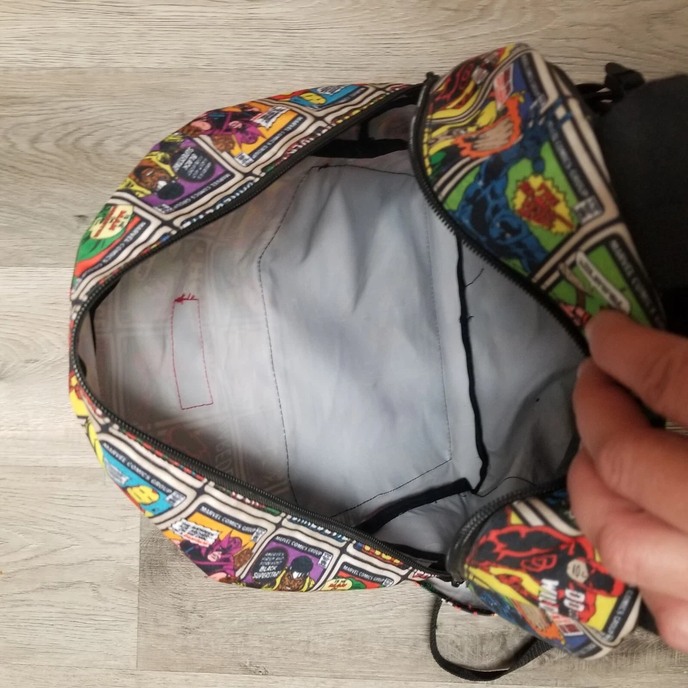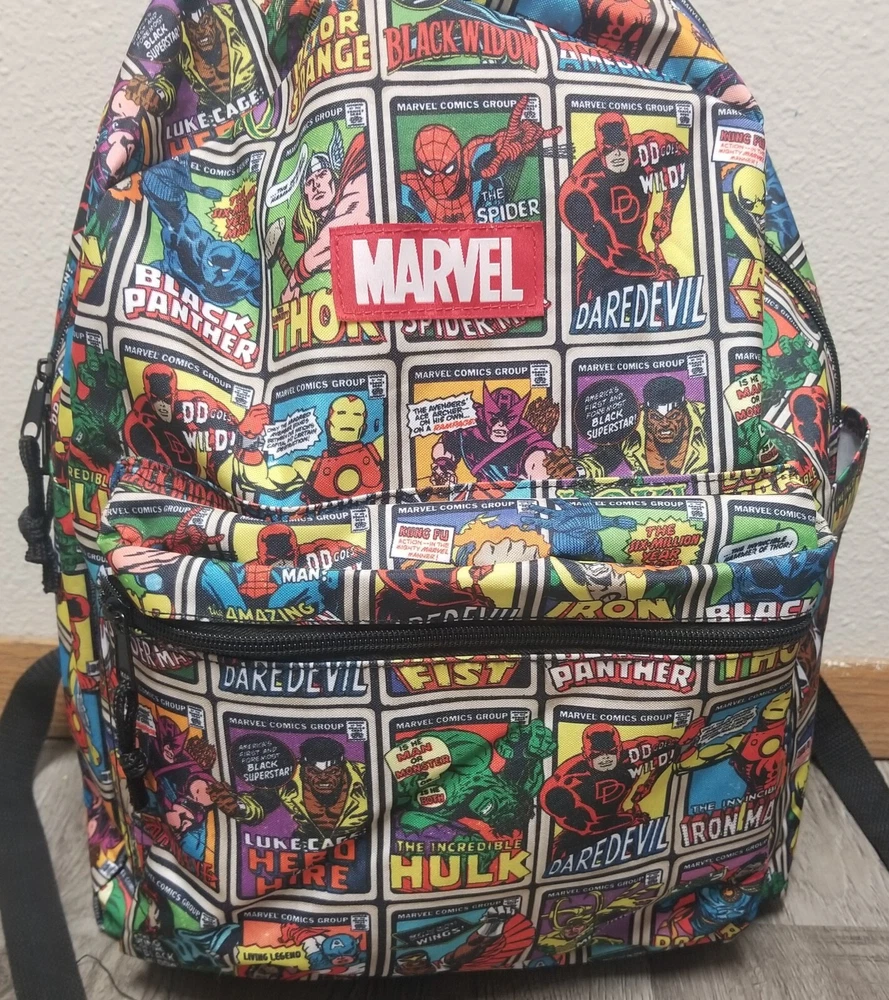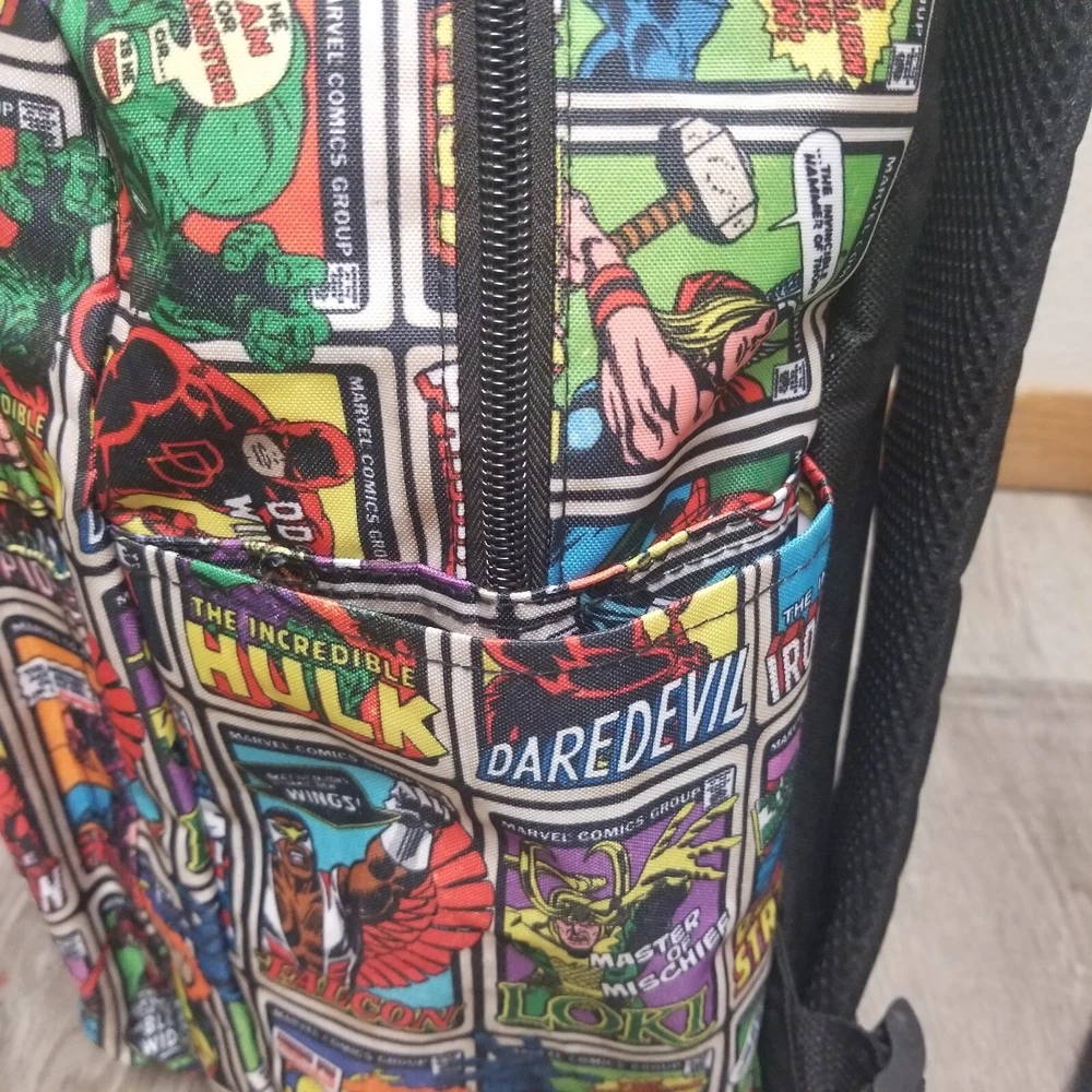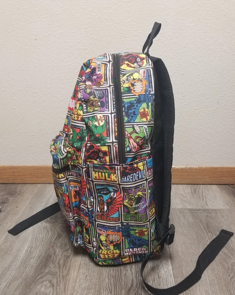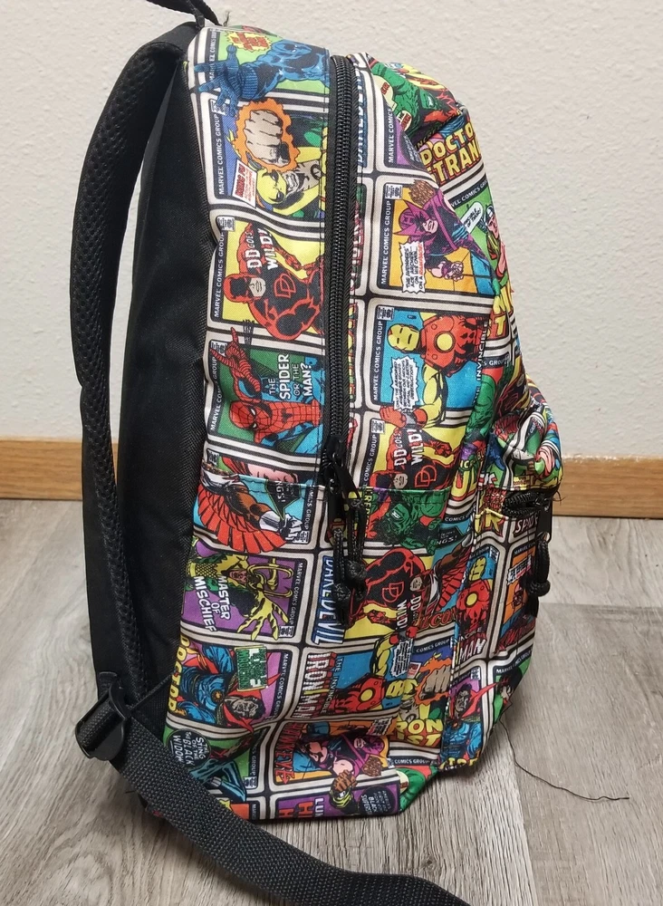 Closure: Zipper Fabric Type: Polyester Theme: Marvel Comics Size: 16" Color: Multicolor Lining Material: Polyester Style: Backpack Character: Marvel Comics Bag Height: 16 in Pattern: Super Heroes Brand: Bioworld Features: Adjustable Strap, Bottle Pocket, Padded, Reflective, Laptop Sleeve Material: Polyester Department: Men Bag Width: 13 in