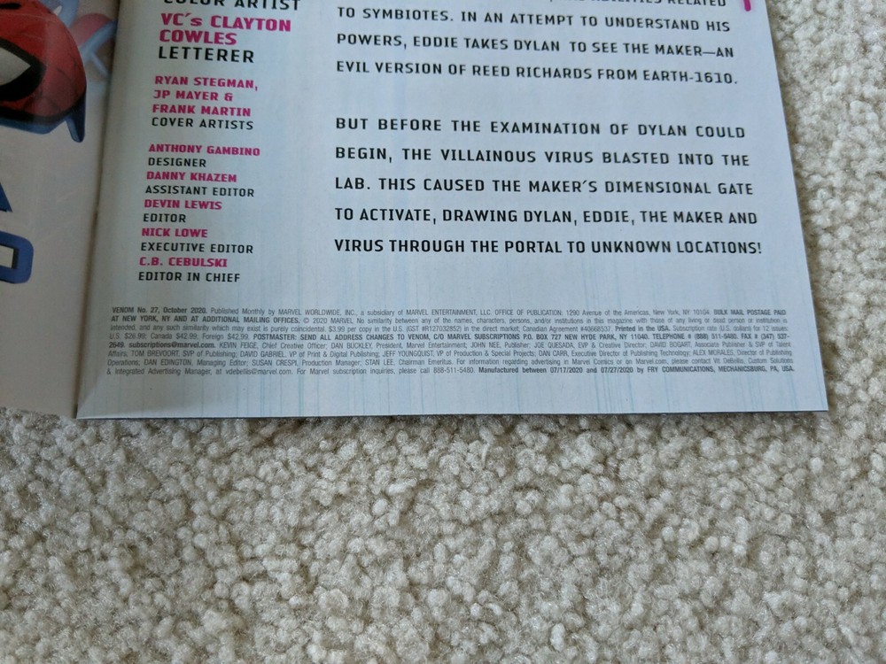 Up for sale is the Marvel Comics Venom 27 1st Print from October 2020. Book comes bagged and boarded. Please see photos for details. Item ships within 24 to 48 hours after payment is received and ships first class mail. Item comes from a smoke free home. Feel free to contact me with any questions. Thank you