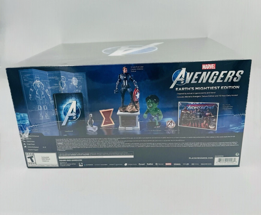 Marvel’s Avengers: Earth’s Mightiest Edition - Microsoft Xbox One - New Condition: • Brand New: Factory-sealed, never opened. Packaging is in excellent condition, perfect for collectors or fans of Marvel’s Avengers. Description: Experience the ultimate Marvel’s Avengers adventure with the Earth’s Mightiest Edition! This exclusive edition is a collector’s dream, offering unique and premium items that celebrate Earth’s most iconic heroes. Play as your favorite Avengers in an epic campaign and exciting multiplayer modes. Includes: • Full game on Microsoft Xbox One (upgradeable to Xbox Series X). • Exclusive SteelBook Case featuring custom artwork. • 12” Captain America Statue: A high-quality collectible designed by the artisans at Gentle Giant. • Black Widow Belt Buckle: Inspired by Natasha Romanoff’s iconic costume. • Iron Man Prototype Armor Blueprint: A detailed schematic print. • Thor’s Mjolnir Keychain: A miniature replica of Thor’s legendary hammer. • Hulk Bobblehead: A fun, officially licensed collectible. • Kamala Khan’s Honorary Avenger Pin: A must-have for fans of Ms. Marvel. • Avengers Group Photo: A memento from the game’s storyline. Features: • Single-Player Campaign & Multiplayer Modes: Join the Avengers to save the world and assemble your friends in co-op missions. • Customizable Heroes: Level up your heroes and unlock gear for unique builds. • Stunning Graphics: Optimized for Xbox One and Xbox Series X for an immersive gaming experience. Shipping: • The item will be securely packaged to ensure it arrives in mint condition. Tracking and insurance are included. Returns: • Returns are accepted within 30 days if the item remains unopened and in its original condition. Buyer pays return shipping costs. Celebrate your love for the Avengers with this premium collector’s edition! A must-have for Marvel fans and gamers alike.