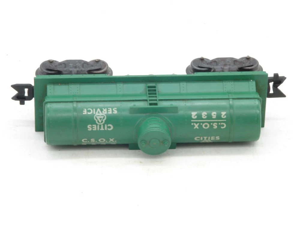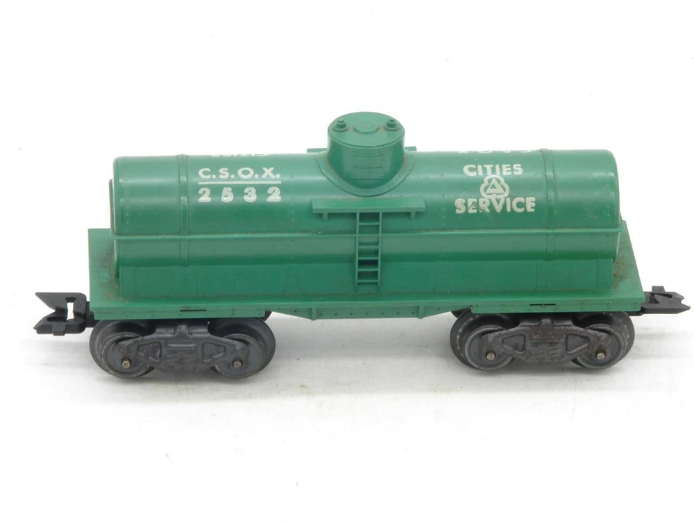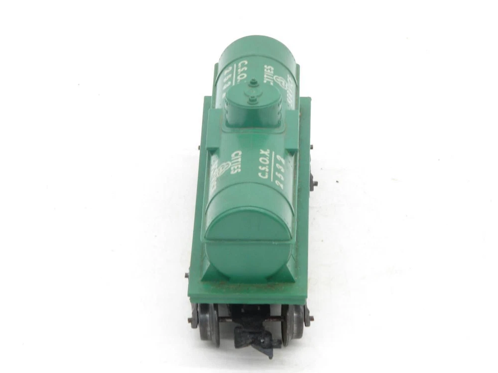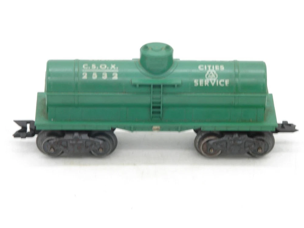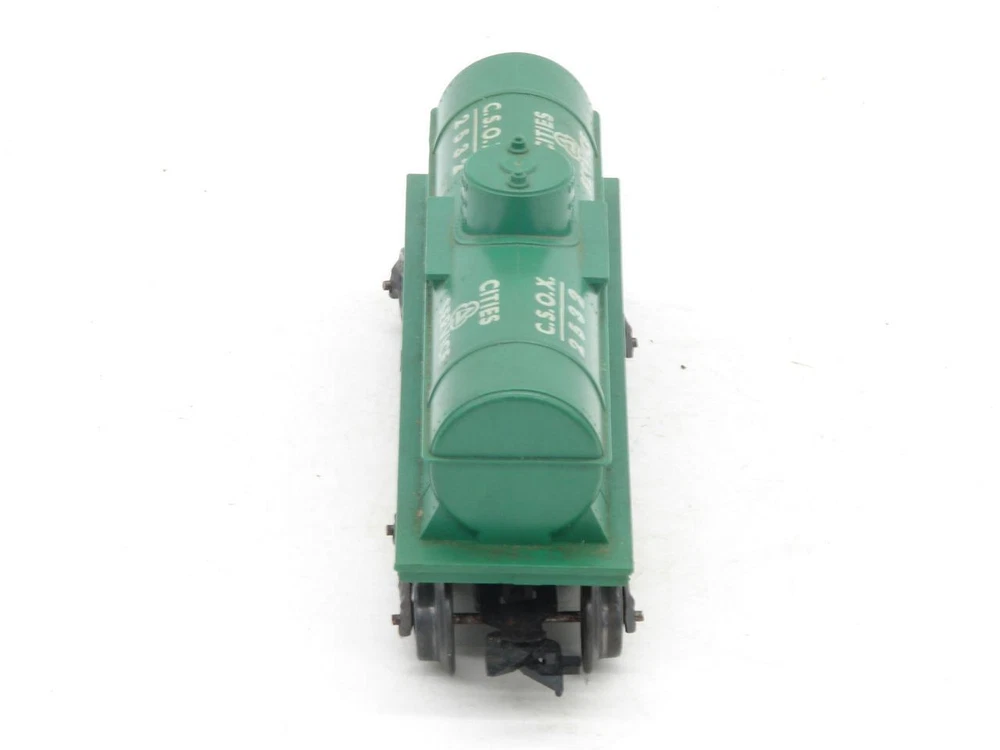 Thanks for looking. Offered is a Marx O Gauge 2532 Cities Service Tank Car. Tank car in good overall condition. Car body shows well with no chips, cracks, or breaks. Edges of the platform on both sides of the dome are intact. Lettering is good but does have a scuff on one side. Underside of the frame has some crazing present. Trucks do have some light rust spots. Wheel backs and axles have some light spots of rust as well. Both plastic scissor couplers work. Car weighs under 1 pound packed for shipping. I happily combine shipping. Marx Trains O Gauge 2532 Green Cities Service Tank Car on G Trucks Marx Trains O Gauge 2532 Green Cities Service Tank Car on G Trucks Click images to enlarge Description Thanks for looking. Offered is a Marx O Gauge 2532 Cities Service Tank Car. Tank car in good overall condition. Car body shows well with no chips, cracks, or breaks. Edges of the platform on both sides of the dome are intact. Lettering is good but does have a scuff on one side. Underside of the frame has some crazing present. Trucks do have some light rust spots. Wheel backs and axles have some light spots of rust as well. Both plastic scissor couplers work. Car weighs under 1 pound packed for shipping. I happily combine shipping. Please use the shopping cart to add the items you are interested in and request a total. A revised invoice with updated shipping will be sent. You can also complete checkout right away, and I will refund any overage paid. Please keep in mind that shipping charges continue to rise. I do not look to make a profit from shipping, the rates are quoted by the carrier and are passed along. Because of the increase in shipping, it is in many cases cheaper to ship 2 or more items together in the same box when you cost average things. Please look to see if there is anything else of interest that can help to lower the overall cost, especially if that other item was something you were interested in anyways. I do try to offer as many shipping options as possible to suit your needs, both as far as cost goes, and speed at which you receive an item. International shipping available. Payment Payments can be made by way of PayPal. Please feel free to email me with any payment questions you may have. Payments are due within 7 days of the auction(s) ending. I will extend the payment period if you are bidding on multiple items. Please let me know when you have completed bidding for items you are interested in, and are ready to receive the corrected totoal for your multi-item purchase. Please do not pay for multi-item purchases until you have received a corrected invoice total. Keep in mind this could take up to an extra day to receive your total. Shipping I happily combine shipping on all purchases. Shipping is made by way of USPS mail. You will have the choice of First Class, Parcel Post/Select, Priority Mail, or Express Mail. These choices will be based upon availabilty for the package size / weight, and destination. I try to offer every available shipping method for your purchase. International Shipping. I happily ship all train / hobby/ collectable items world wide. Please contact me for details to make sure your country does not have shipping restrictions. Please keep in mind that shipping times are estimates, and parcels may be held up by customs. International shipping is by way of USPS Mail. Your choice of First Class Package, Priority International, or Express Mail International. NOTE: First class package may not be available for large orders. International Customs Fees. Additioanl import or duties fees may be charged by your country. These potential fees are not included in the shipping paid on your purchase. Please contact your customs / duties office to check on any additional fees that could due. FEEL FREE TO CONTACT ME WITH ANY SHIPPING QUESTIONS YOU MAY HAVE. Terms of Sale Due to the nature of the items being offered for sale, purchases are considered final. Every effort is made to give as honest a review of an item being offered as possible. Since many of these items are vintage, proper operation of these items is difficult to guarantee. Most items are either bench tested, or tested on a layout prior to listing. Please feel free to contact me prior to bidding or purchasing an item if you have any additional questions you would like answered. Contact Us Please feel free to contact me with any questions you may have about an item being offered for sale. I will do my best to get back back in touch with you the same or very next day. Images sell! Get Supersized Images & Free Image Hosting Showcase your items with Auctiva's Listing Templates! THE simple solution for eBay sellers. Track Page Views With Auctiva's Counter