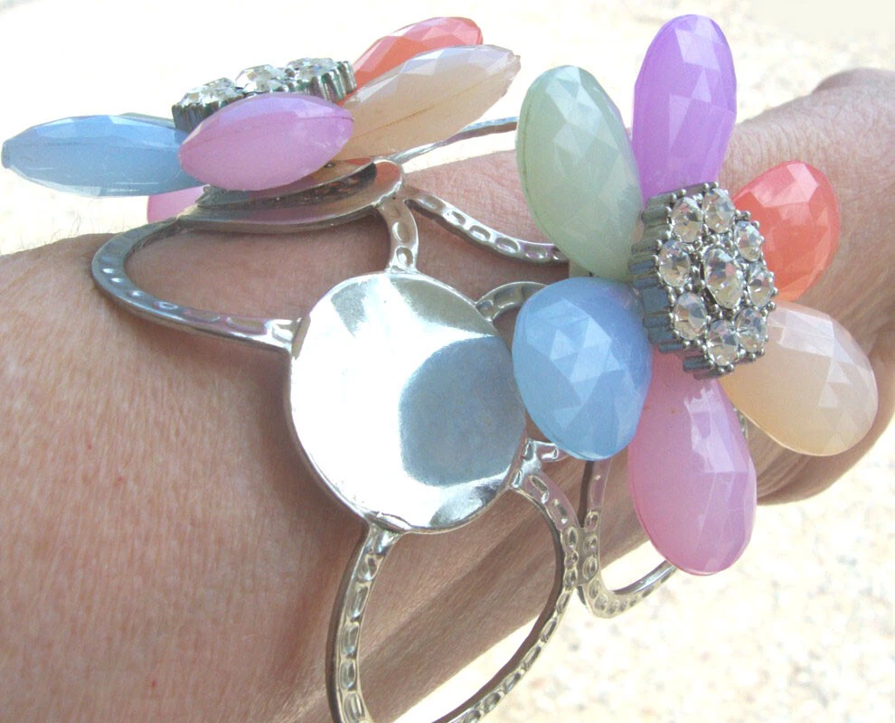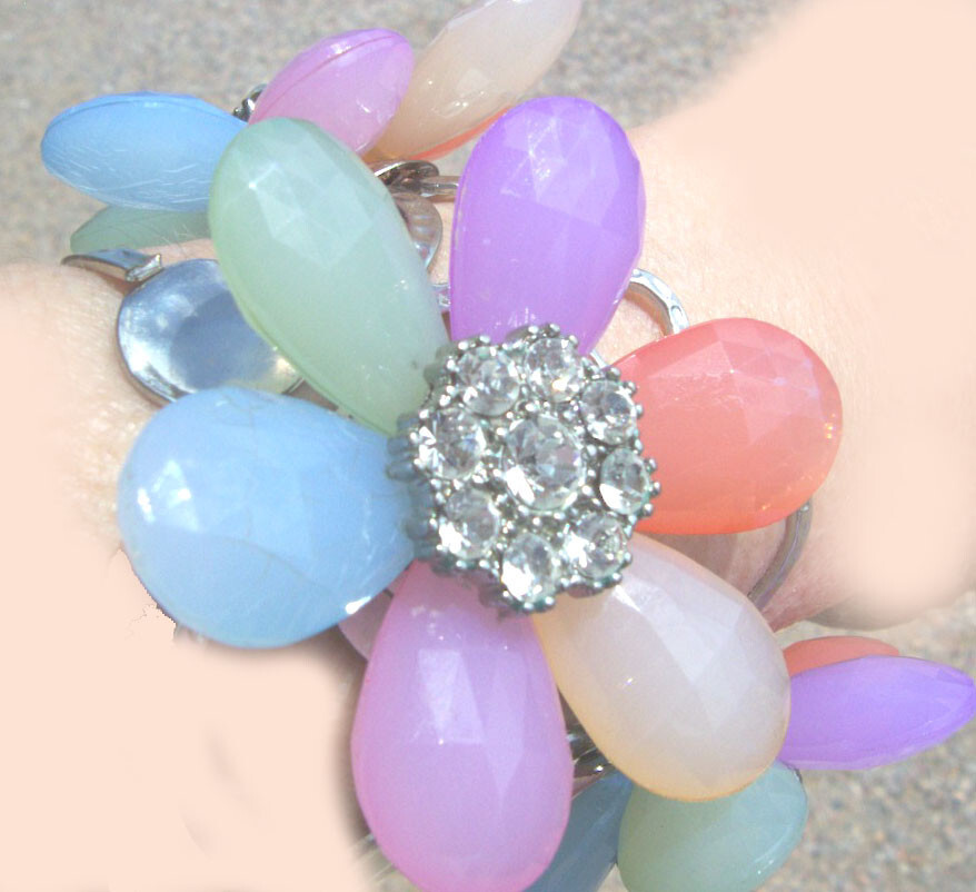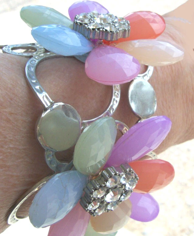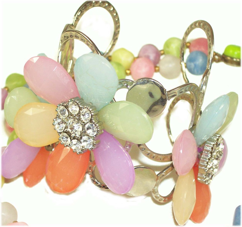 Soft Pastel Necklace 24" & Rhinestone Flower Bracelet Adjustable! Soft Orange, Light Purple, Pastel Yellow, Mint Green, Baby Blue! Rare! One Of A Kind! Never to be Found Again Set! Measurements are Approximate! This jewelry was gifted to me from my Mary Kay Sales Director. Gifts For Achievements by Selling thousand of dollars of Mary Kay Cosmetics!