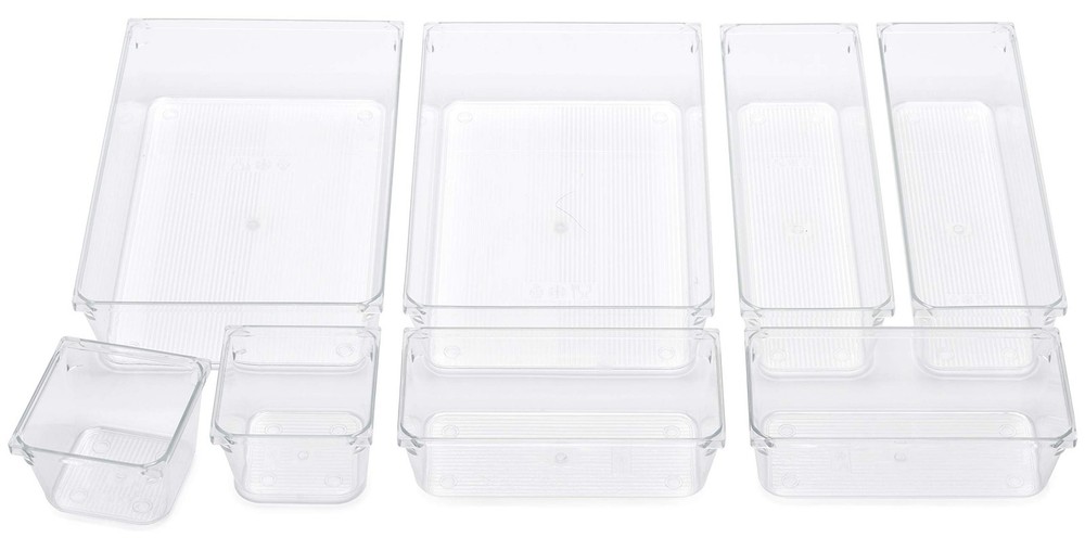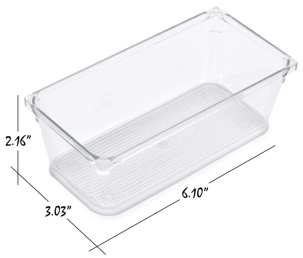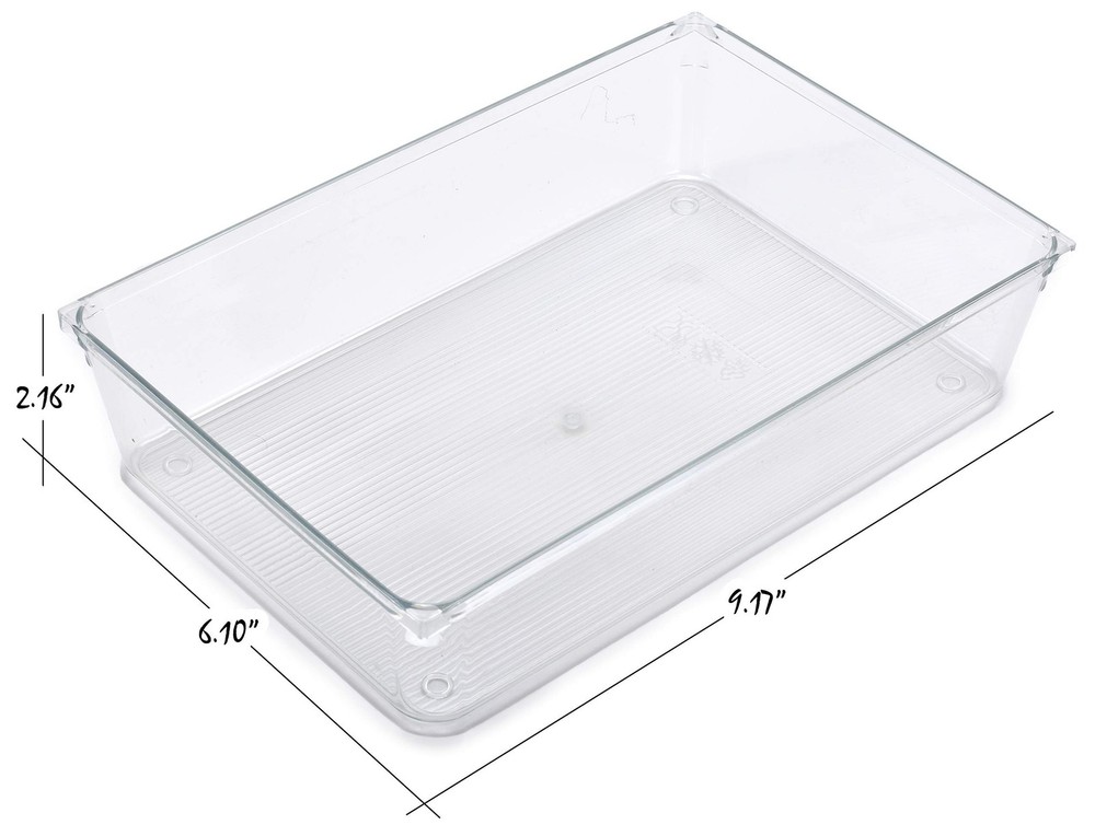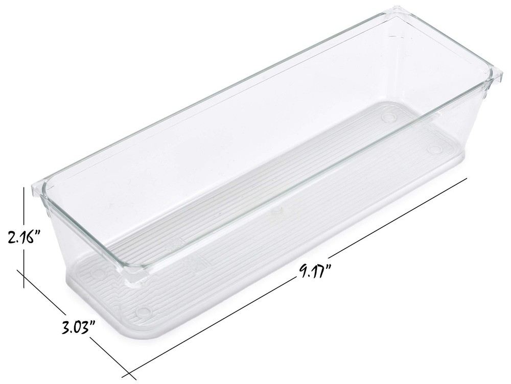 Masirs Clear Drawer Organizer - Easily Organize and Customize the Layout of Drawers. Great for Office Desk, Utensils, Cosmetics and Makeup. (8-Piece Set) Product Details Size: 8-Piece Set Brand: Masirs MPN: 5608 UPC: 021455056084 EAN: 0021455056084 Color: Clear Material: Plastic Item Weight: 2.05 Pounds Brand: Masirs Finish Type: Polished Manufacturer: ‎Masirs UPC: ‎021455056084 Part Number: ‎5608 Item Weight: ‎2.05 pounds Product Dimensions: ‎6 x 8 x 2 inches Item model number: ‎5608 Size: ‎8-Piece Set Finish: ‎Polished Item Package Quantity: ‎1 Number Of Pieces: ‎8 Mounting Type: ‎Insert Special Features: ‎Compact Usage: ‎Cosmetics,Utensils Batteries Included?: ‎No Batteries Required?: ‎No Date First Available: December 9, 2020 MULTIPURPOSE: Perfect for storing office supplies, cosmetic products, sewing and crafting supplies. KEEPS YOUR DRAWERS ORGANIZED: Enables you to arrange items neatly, and keep everything easily visible and accessible. THICK DURABLE PLASTIC, EASY STORAGE: Clear, classy design fits in beautifully with decor in any room. Plus, trays nest in each other for convenient compact storage. RIDGED BOTTOM DESIGN: Prevents trays from sliding around freely in a drawer, so everything stays neat. VARIED SIZES: Two each of four different sizes that can be arranged to suit your particular needs. Place in your drawers in the direction and combination that works for you.