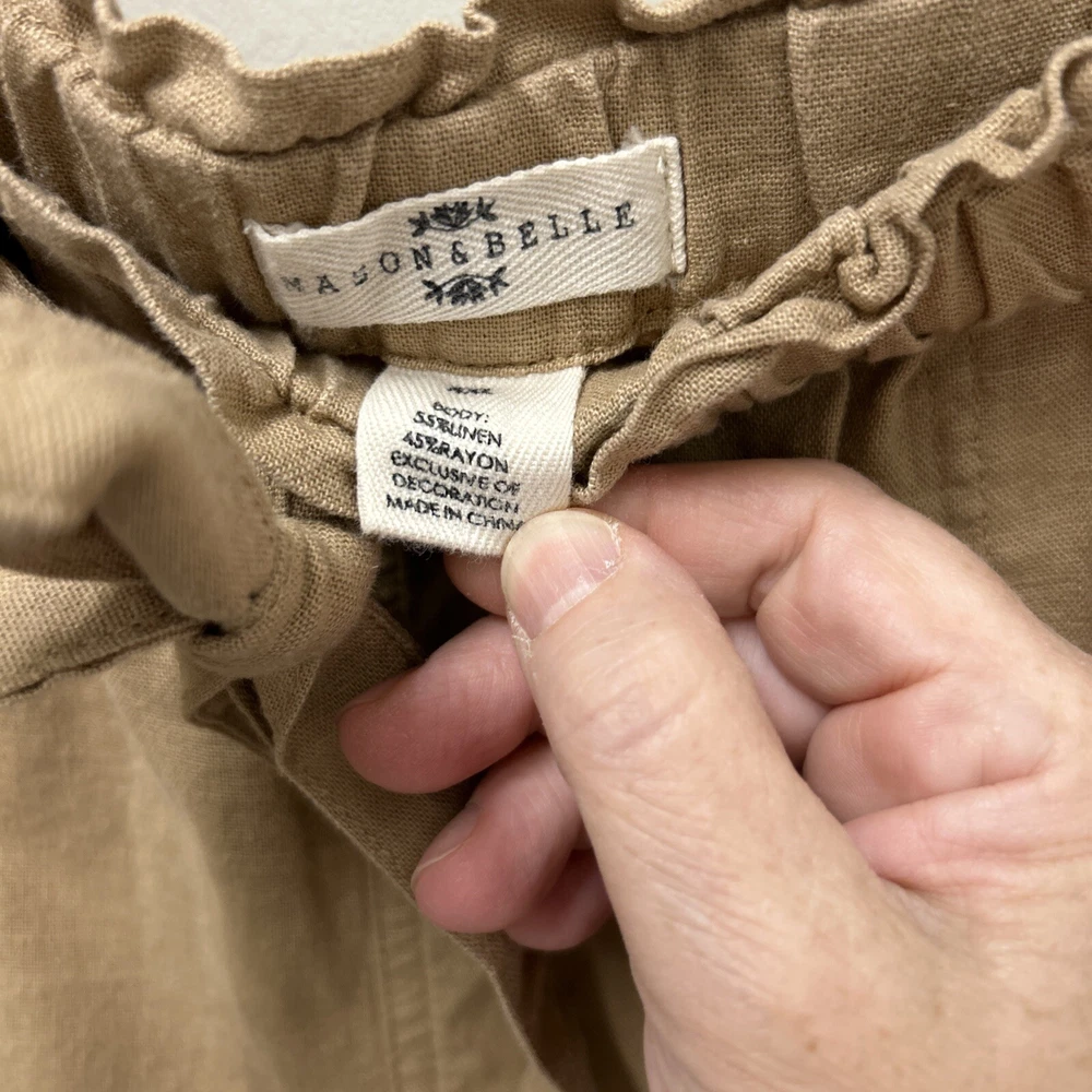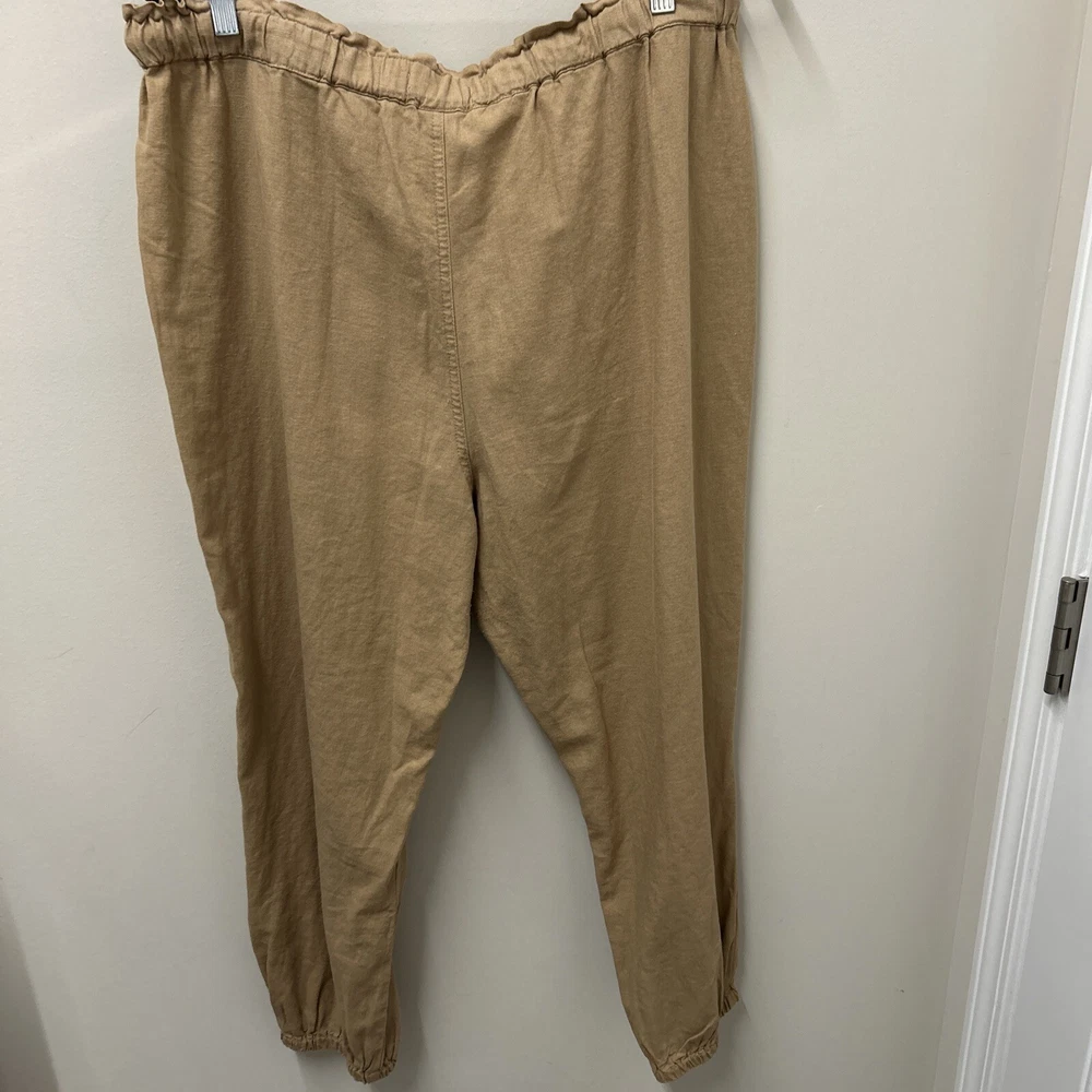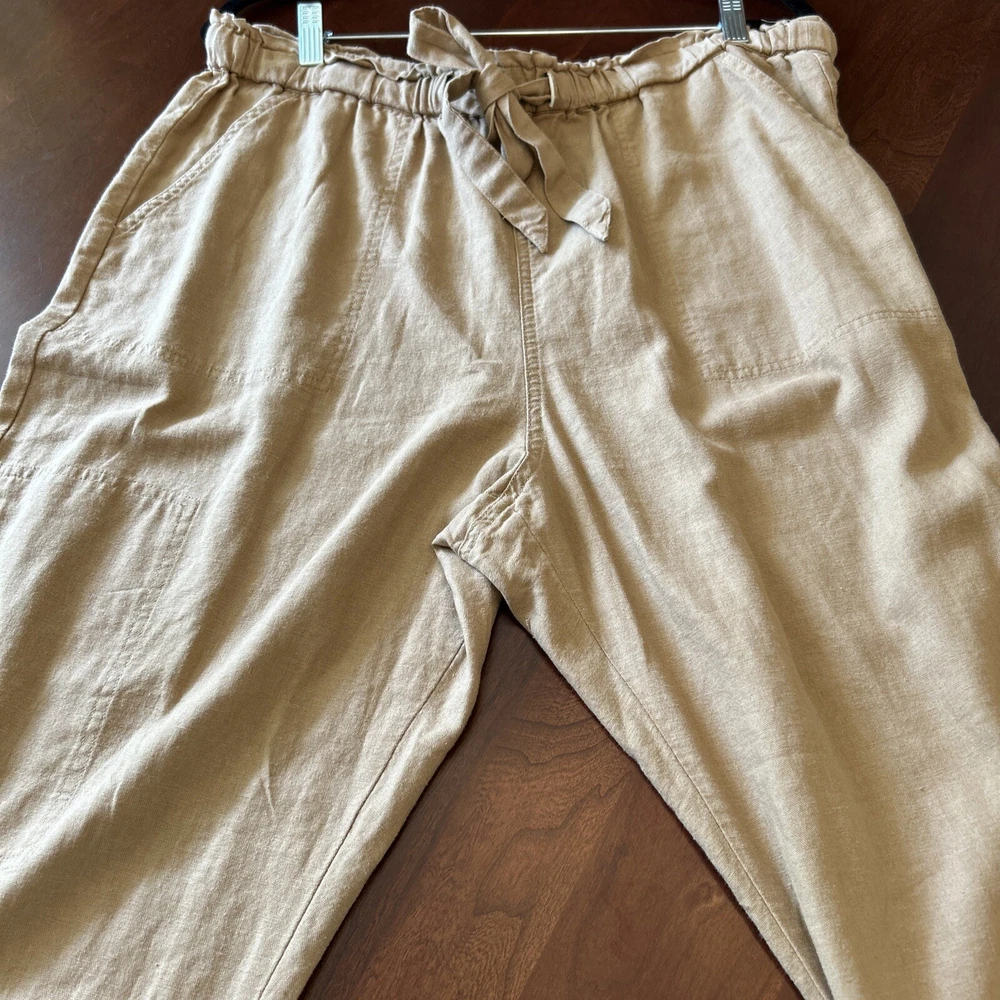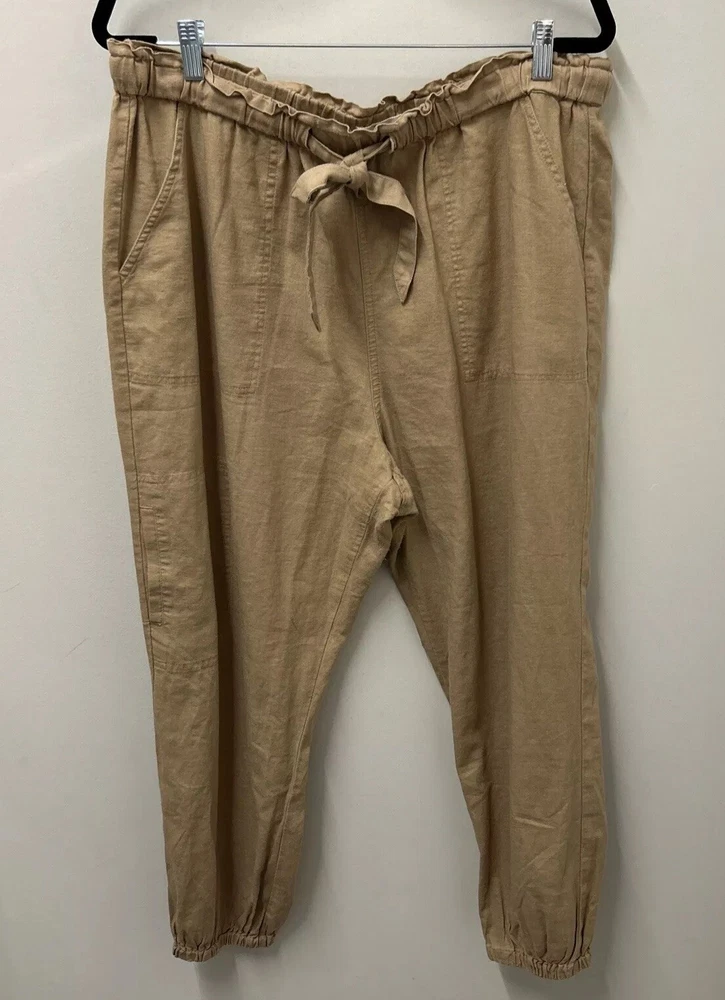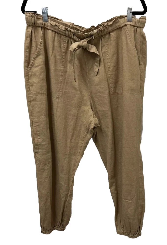 Mason & Belle Womens Joggers XXL Tan Tie Waist Belted Utility Linen Blend Elevate your casual wardrobe with these stylish Mason & Belle women's joggers. Crafted from a linen blend fabric, these pants feature a tie waist belted closure, elastic hem, and deep cargo style front pockets for a comfortable and relaxed fit. The jogger design and flat front create a flattering silhouette, perfect for any occasion from travel to parties or just running errands. These pants are available in size 2XL and come in a trendy brown color that is perfect for summer, fall, or spring. Fit- XXL fits around a size 16. Bohemian, Summer, Island, Vacation, Beach, Lightweight, Breathable, Coastal