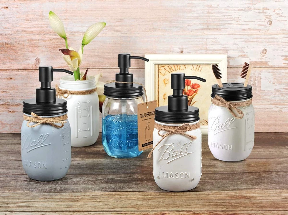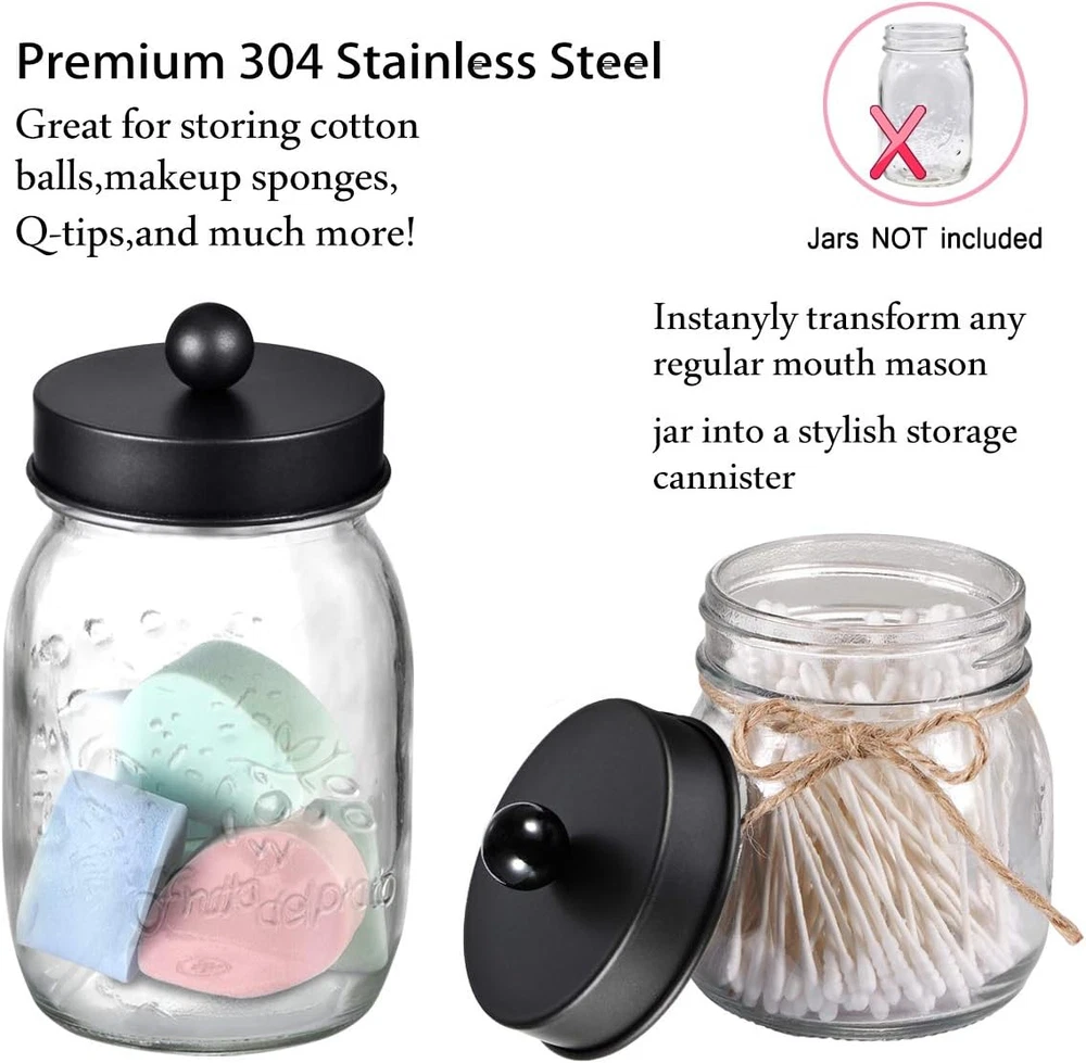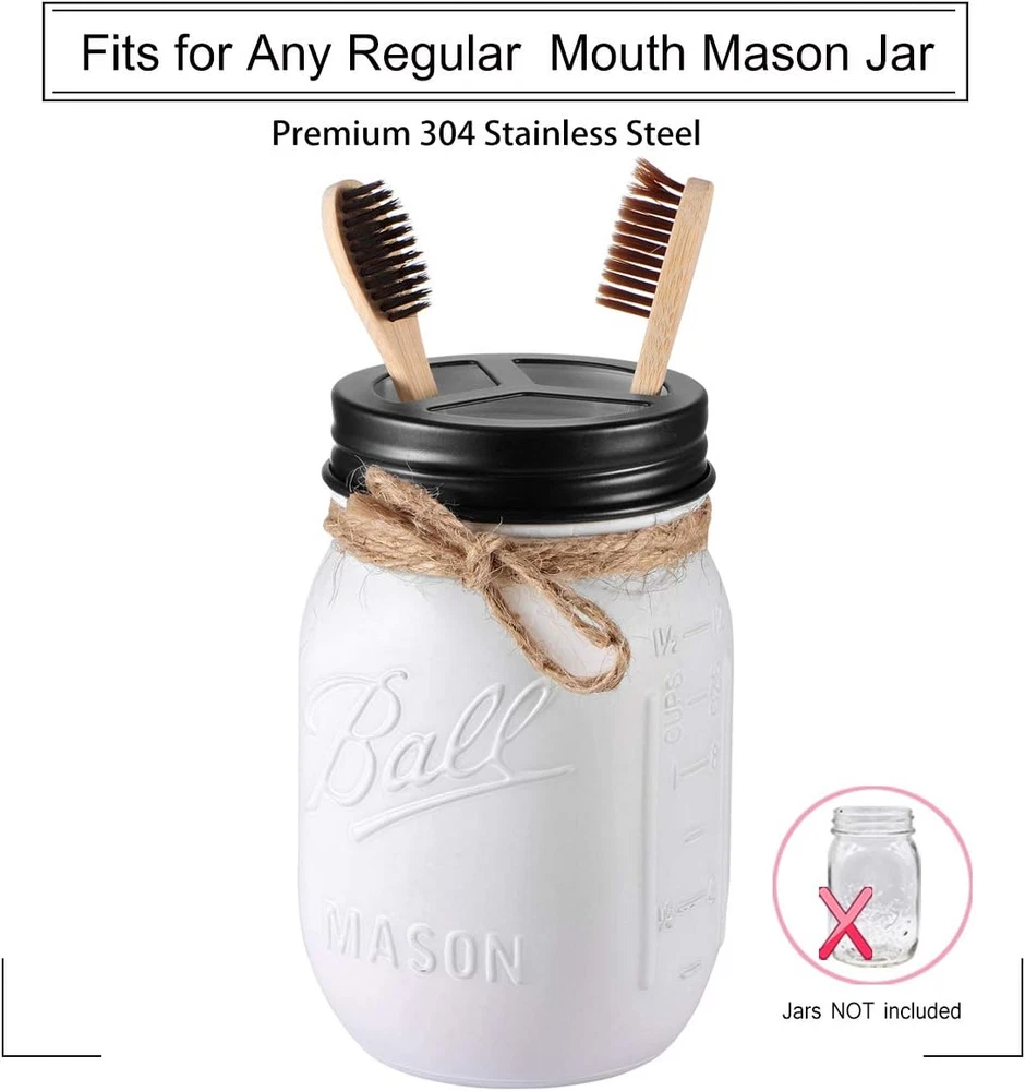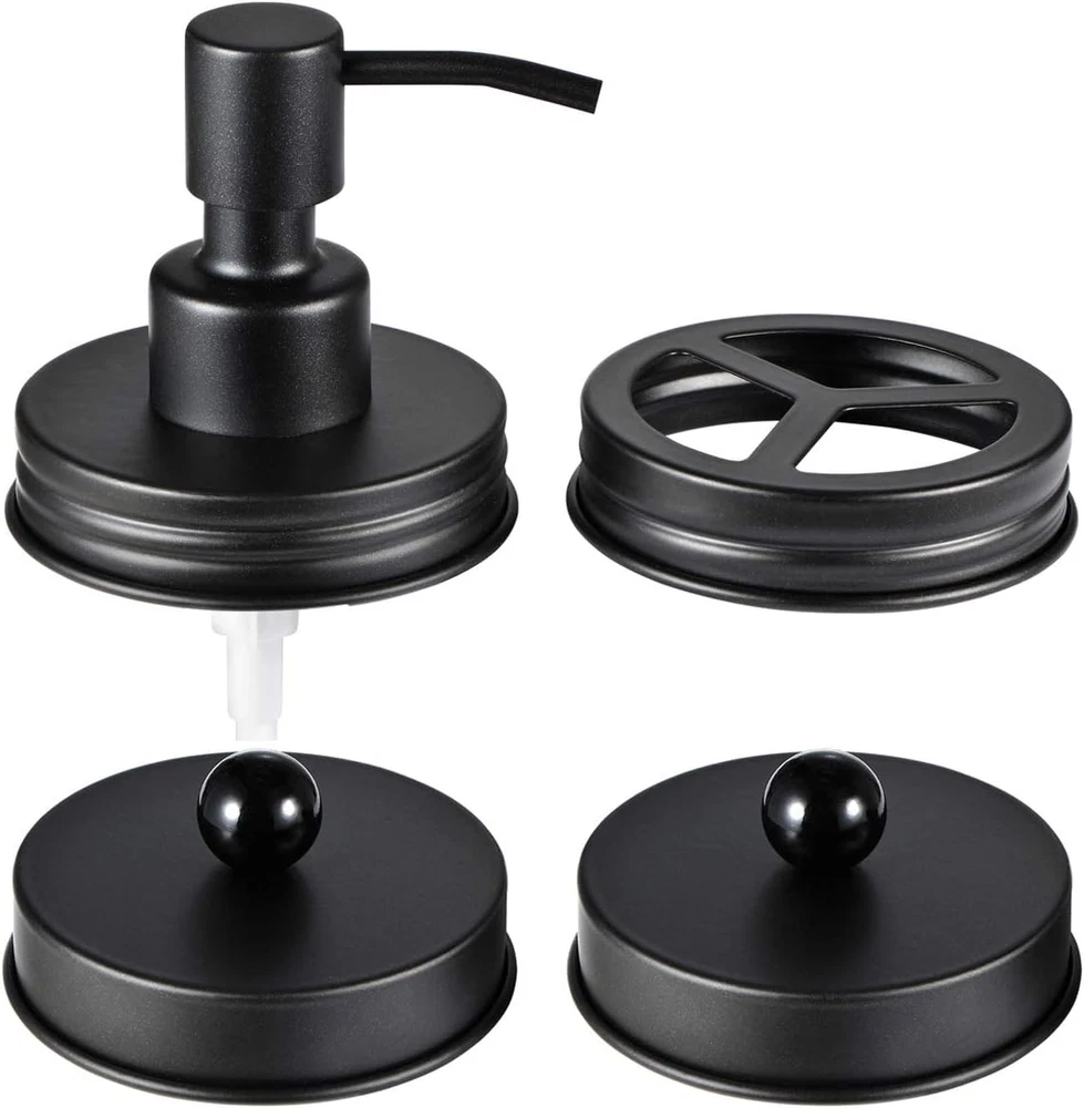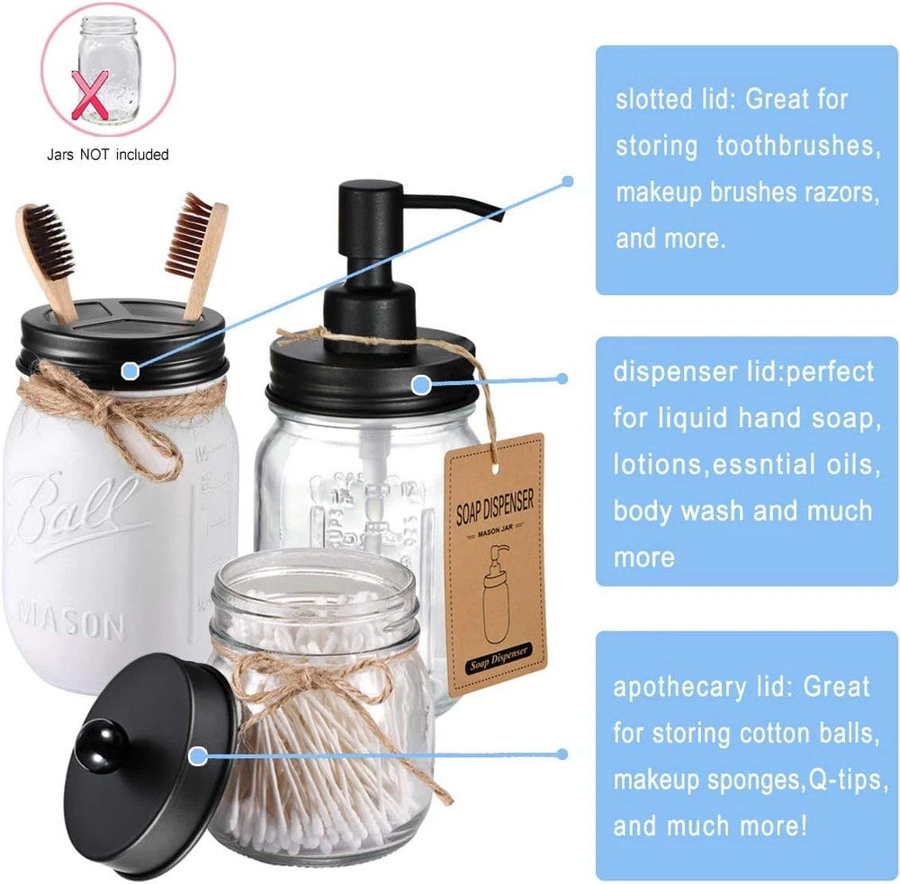 ✔4PCS MASON JAR LIDS(JARS NOT INCLUDED) : This lids set including 1soap dispenser pump,1 toothbrush holder lids and 2 apothecary storage jars lids,1bath soap sticker,1toothbrush lables,1cotton ball sticker. These lids fit on any brand of REGULAR MOUTH SIZED mason jar(Ball, Kerr, Anchor Hocking, Libbey, and many more!). It’s a cute shabby chic home accessories set you can get ! Ideal modern rustic farmhouse decor! 304 stainless steel components prevent rust and corrosion! ✔ MULTIPURPOSE SOAP DISPENSER PUMP: Great for liquid soap, body wash, shampoos, mouthwash,hand sanitizer, creams, homemade lotions, perfume blends, sunscreen, aromatherapy, oil storage and more. Use in the kitchen, bathroom, laundry room, beauty salon . . . These dispenser lids are compatible with ALL liquid soaps (NOT foaming soaps) ✔BEAUTIFUL TOOTHBRUSH HOLDER LID: Practical and functional,our mason jar toothbrushes holder lid features 3 holes ,great for storing toothbrushes,makeup brushes,razors,flossers and more. ✔CUTE APOTHECARY JARS LIDS:Put the lids on top of your favorite regular mouth mason jars and you will instantly have a farmhouse style bathroom storage canister set. Great for storing cotton balls,qtips,bath scrubs,cotton rounds ,makeup sponges and more(NO THREAD,The lid would not screw onto the jar, so it comes off very easily and needn't screw on the jar ) ✔RISK-FREE GUARANTEE :if you're not completely satisfied, just let us know and we will offer you a satisfaction .No question asked with 30-Day Money Back if you’re not satisfied Product Description Would you like to give your bathroom some unique style? Choosing the Mason Jar Bathroom Accessories lids Set is something that shouldn't be missing in bathroom kitchen farmhouse décor Pac kage Includes:4P CS Mason Jar LIDS, one soap dispenser pump,one toothbrush holder lids and two apothecary storage jars lids. The toothbrush holder lid is great for storing toothbrushes, razors, makeup brushes,flossers and much more! The apothecary storage jars lids are great for storing cotton balls,qtips,bath scrubs,cotton rounds ,makeup sponges and more The soap dispenser pump is great for liquid soap,dish soap, body wash, shampoos, mouthwash,hand sanitizer, creams, homemade lotions,dishwashing/laundry detergent, perfume blends, sunscreen, aromatherapy, oil storage and more. Use in the kitchen, bathroom, laundry room, beauty salon... Material: Rust-proof Premium 304 Stainless Steel (the soap dispenser pump NOT). Our mason jar lids are truly rustproof. These lids are constructed from durable stainless steel and will surely withstand the test of time! These particular mason jar dispenser lids have a luxurious, glossy oil-rubbed finish. These lids will compliment your oil-rubbed bathroom or kitchen faucets beautifully. Please Kindly Note: Jars are not included,the lids Not fits on wide mouth mason jars. These dispenser lids are for regular mouth mason jars (AKA small mouth) These dispenser lids are NOT compatible with large mouth mason jars. Measure the mouth of your mason jar beforehand to make sure that these lids will fit. The diameter of a regular mouth mason jar is about 2.38 inches, and the diameter of a large mouth mason jar is about 3 inches Save the Environment By substituting single-use plastic soap bottles with these dispenser lids on top of a reusable mason jar, you are doing a great service to preserving our beautiful environment!