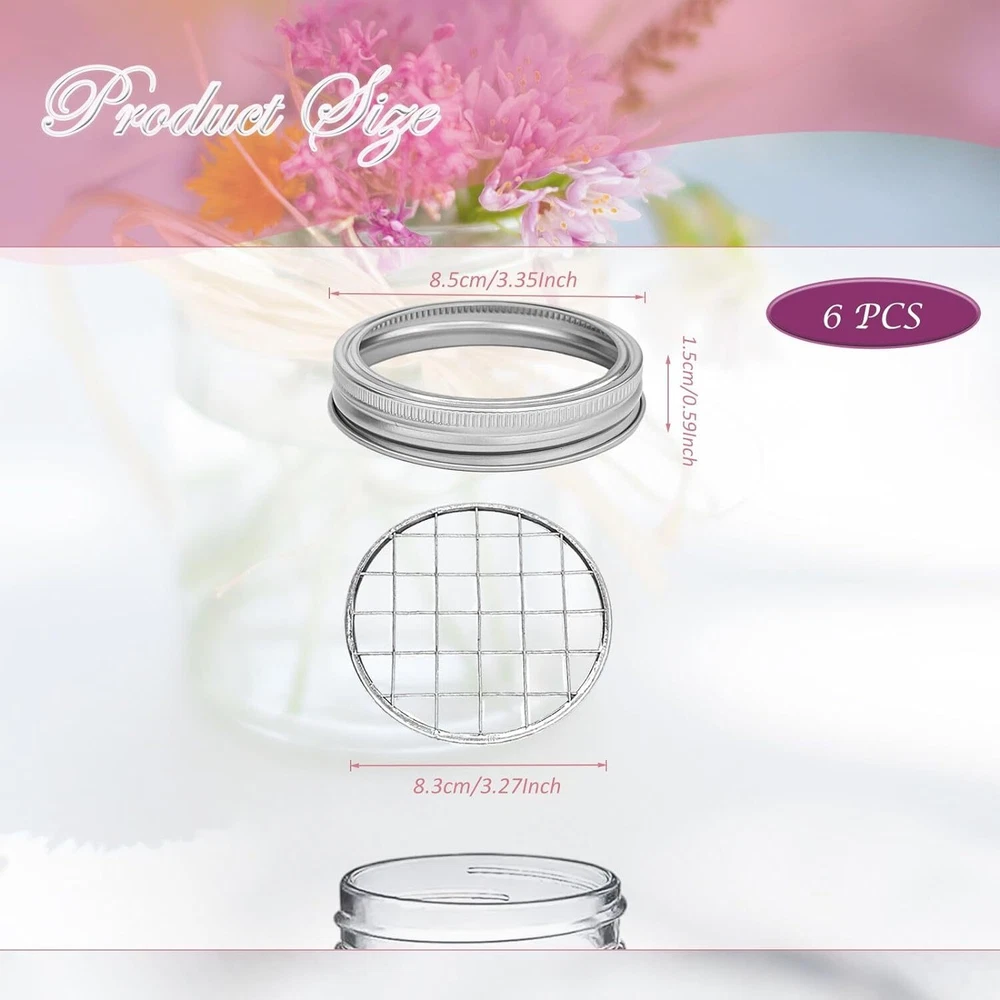 Mason Jar Flower Insert Lids Wide Mouth Mason Canning Jars Flower Lid Insert Flower Organizer Lid Insert With Square Grids 6 PCS Product Details Material: Tin, Metal Brand: SHERY Style: Compact Shape: Round Number of Pieces: 6 Is Dishwasher Safe: Yes Closure Type: Snap Is Microwaveable: Yes Manufacturer: SHERY Part Number: Mason Jar Flower Insert Lids Item Weight: 5.6 ounces Package Dimensions: 3.2 x 3.2 x 1.5 inches Item model number: Mason Jar Flower Insert Lids Included Components: Mason Jar Flower Insert Lids Batteries Included?: No Batteries Required?: No Material: Tin, Metal Brand: SHERY Style: Compact Shape: Round Number of Pieces: 6 Mason flower jar :You will receive 6 pieces of Mason flower jar insert lids (diameter 3.4 inch, height 0.59 inch)+6 pieces of grids. You can insert flowers or plants in the jar through the grid easily to make your room beautiful. Premium material: each metal flower lid is made of tin. It is not easy to deform, tear or break, so it can maintain for a long time; The surfaces of these lids are smooth, will not scratch your fingers Good organizer: With the grid design, the flowers in the vase will not lean unsteadly. You can insert the flowers or plants through the grid, which can keep them in the position where you want them to be. Wide applications: these mason grid lids are not only suitable for flowers, but also can be applied for organize toothbrushes, pens, stationery and other things in different bottles. Delicate design: our grid organizer lids adopt circle design, which can better adapt to different bottlesIf you have any questions, please contact us, we will reply as soon as possible to solve the problem.