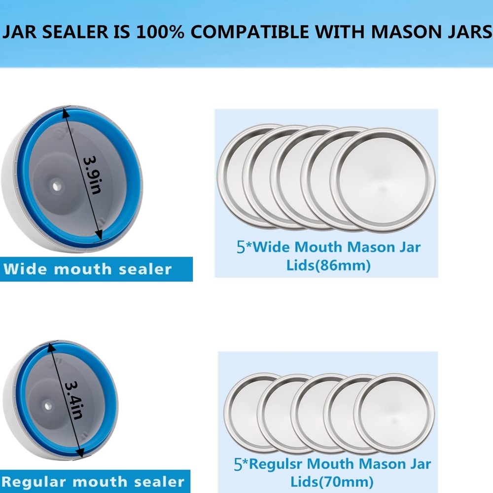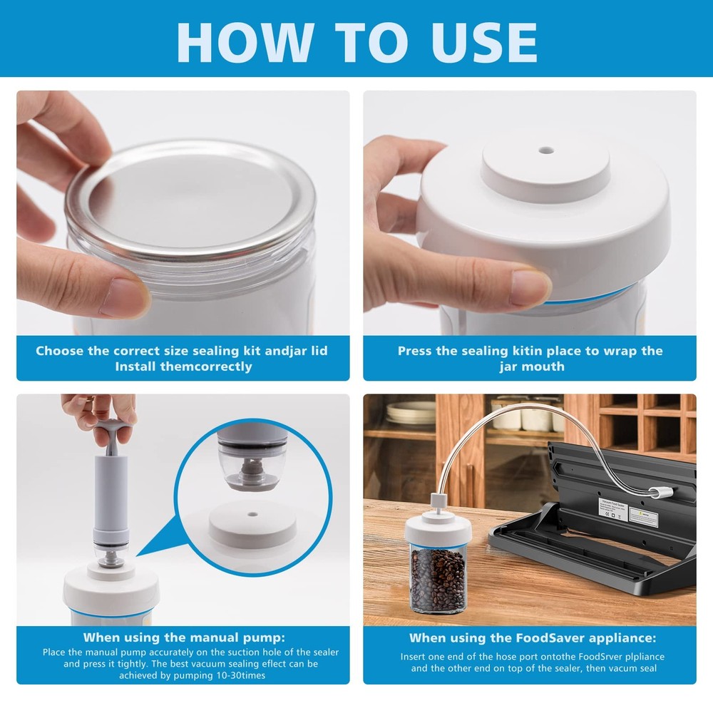 Mason Jar Vacuum Sealer and Accessory Hose Compatible with Foodsaver Vacuum Seal 【 Mason Jar Vacuum Sealer Kit】- Embrace the power of comprehensive kit, featuring 1 wide mouth jar sealer, 1 regular-mouth jar sealer, 2 hose connectors,suitable to use as food sealer 1 manual vacuum pump, 1 lid opener, 1 user guide, 5 wide-mouth Mason jar lids, and 5 regular-mouth Mason jar lids. To enhance your experience, we have included additional updated more lids.Food Grade,BPA Free 【Compatible with FoodSaver】-Jar vacuum sealer kit's food grade silicone pumping hose can only be used with FoodSaver vacuum sealer machine,Compatible with most foodsaver vacuum machines, which can be applied to models V3230/v2440/vS1100/v2251/v2244/v3400/vac500/vac750/vac800/v365/v2862 /v2460/v3250/FM5200(Note: Not compatible with these models of FoodSaver: FM2000, FM2100, FM2500, FM4800, FM4900, FM 5800; VS0160, VS1130, VS0100, VS0150 【Manual +Automatic Perfect Combination 】-Jar vacuum sealer for mason jar is equipped with a manual vacuum pump.If you don't have a FoodSaver vacuum sealer,Is the FoodSaver vacuum sealer machine too big to carry around on a trip or picnic? Don't worry! you can use a hand pump, which will pump out the air in the mason jar 【Vacuum Sealer for Jars Kit】 is made of high-density ABS plastic, BPA free, non-toxic and odorless Easy to clean by hand or in the dishwasher ,Sealer creates an airtight vacuum seal on the jar lid to keep food fresh and prevent odors and moisture for the safe storage of foods,fit as jams chocolate sauce, rice, mustard and dry foods, 2 hose connectors,suitable to use as food sealer 【Food Saver Jar Sealer Attachment】-5Pcs* Wide-mouth Jar Lids (86 mm) and 5Pcs* Regular-mouth Jar Lids (70 mm)More caps spare consumables, no extra money to buy, can't open in time Sealed mason jar lids? Don't worry, we have a dedicated lid opener that allows you to easily open Mason lids. The compact and delicate aluminum design makes it durable and easy to carry.Also can be a Mother's Day gift for mom, friends and family vacuum sealer for jars mason jar vacuum sealer mason jar vacuum sealer kit jar vacuum sealer for mason jars vacuum seal containers food saver jar sealer attachment handheld vacuum sealer mason jar sealer food saver containers for vacuum seal mason jar vacuum sealer hand pump jar sealer for mason jars jar vacuum sealer vacuum sealer for mason jars vacuum sealer containers mason jar sealer vacuum kit jar sealer foodsaver accessories can sealer food saver jar sealer vacuum chamber sealer vacuum seal jars food saver handheld vacuum sealer can sealer machine Shipping We offer FREE shipping on all orders! We ship within Three business days of payment, usually sooner. We use a selection of shipping services such as UPS, FedEx, USPS etc. We only ship to the lower 48 states, no APO/FPO addresses or PO Boxes allowed. Local pickups and combined shipping options are not provided at this time. Return You can return a product for up to 30 days from the date you purchased it. Any product you return must be in the same condition you received it and in the original packaging. Please keep the receipt. Payment We accept payment by any of the following methods: PayPal Please pay as soon as possible after winning an auction, as that will allow us to post your item to you sooner! Feedback Customer satisfaction is very important to us. If you have any problem with your order, please contact us and we will do our best to make you satisfied. Contact Us If you have any queries, please contact us via ebay. We usually respond within 24 hours on weekdays. Please visit our eBay store to check out other items for sale! Thank you for shopping at our store.