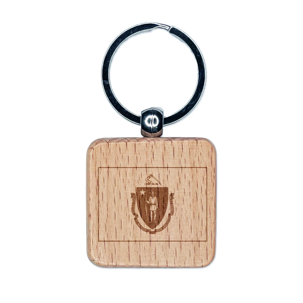 Massachusetts State Flag Engraved Wood Square Keychain Tag Charm