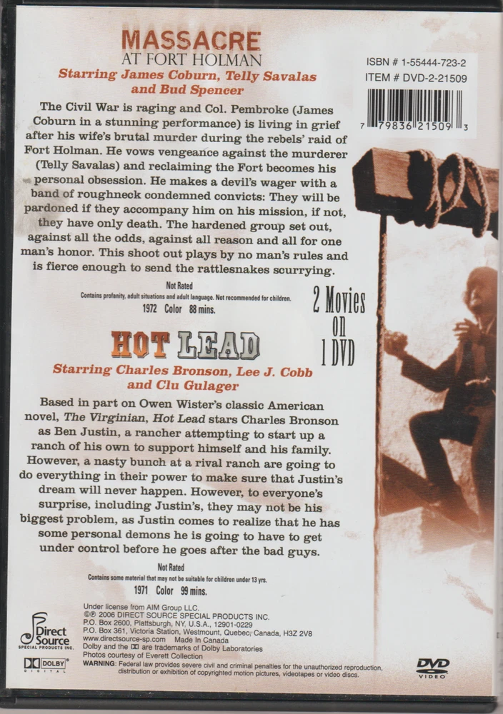 MASSACRE AT FORT HOLMAN & HOT LEAD DVD, 1972, James Coburn, Bud Spencer, Telly Savalas, Reinhard Kolldehoff, Jose Suarez, Francisco Sanz, Angel Alvarez, Mario Pardo, Concha Rabal, Ugo Fangareggi, Benito Stefanelli, Guy Mairesse, Fabrizio Moresco, Alejandro de Enciso, Adolfo Lastretti, Turam Quibo, Carla Mancini, Joe Pollini,. March 1862, Territory of New Mexico. Dishonoured and captured by the ambitious Union officer, Colonel Ballard, the former Union colonel, Pembroke, finds himself before an urgent dilemma: he is to retake Fort Holman from the Confederates, or meet his Maker. Of course, this is an impossible task, and now, Pembroke's hopes to pull off this suicidal mission rest in the hands of a motley crew of condemned cut-throats, deserters, horse-thieves, and murderers, including the looter, Eli Sampson. But, at the impregnable stronghold, deadly, rapid-fire Gatling guns await, paired with Major Frank Ward's highly sophisticated security system. Has anyone ever infiltrated the impenetrable fortress and lived to tell the tale? Director Tonino Valarii - Drama - Western - Rated PG,