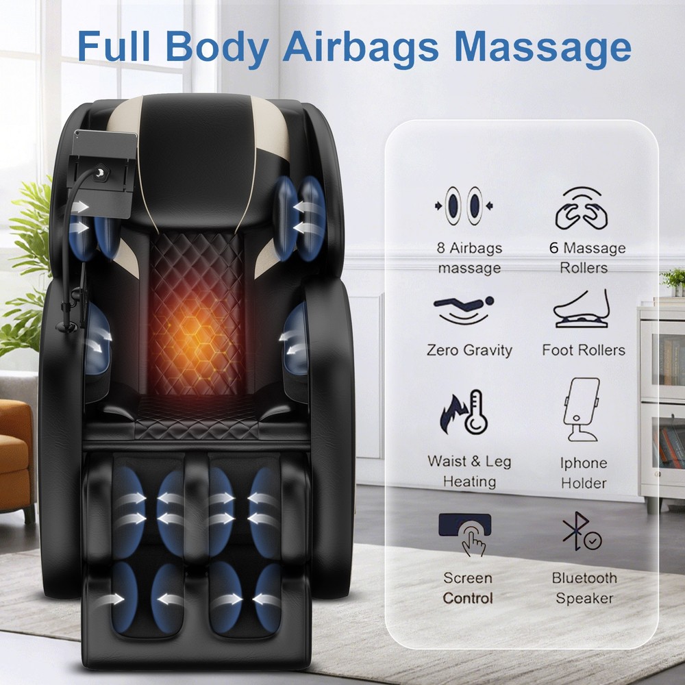 Massage Chair Full Body, Zero Gravity Massage Chair Recliner with Heating Features [Full-body massage] The massage chair has 8 fixed rollers on the backrest to provide targeted massage therapy for the neck, back and lumbar area. You can customize your massage experience by choosing from 5 preset automatic modes. The lumbar and leg areas are equipped with a heating function to improve blood circulation and relieve sore muscles. Multiple airbags are also included for an adjustable pressure massage with three intensity levels for shoulders, arms and calves. [Foot relaxation] The massage chair comes equipped with a retractable footrest that adjusts to accommodate various heights, ensuring a personalized fit for every user. Located at the base of the feet, the footrest provides a soothing kneading massage using rollers, offering a relaxing experience. As the rollers spin, they stimulate acupressure points, and the integrated leg heating function effectively promotes blood circulation while relieving muscle tension in the legs and feet. [Zero Gravity mode] By pressing the "zero gravity" button, you can fully recline with your feet elevated above your heart, reducing strain on your cardiovascular system and promoting better blood circulation. The armrests and seat tilt simultaneously, allowing your hands to continue enjoying the massage. Even after the massage session ends, the chair remains in zero gravity mode, enabling you to stay comfortably reclined for an enhanced relaxation experience. [Humanized design] The base is equipped with wheels, allowing you to easily move the chair around the room. Bluetooth audio connectivity allows you to enjoy your favorite music while enjoying your massage. The sides of the massage chair are equipped with soothing blue ambient lighting to create a calm and relaxing atmosphere during your massage. This full body massage chair accommodates users weighing up to 180 pounds and up to 6.1 feet tall. [Top Gift Choice]Whether you're treating yourself to some well-deserved relaxation after a long day at work, or looking for a special gift for your beloved parents or friends, this massage chair is a thoughtful choice that brings comfort, relaxation, and health to their lives. It's the perfect way to express your care and affection. This massage chair not only enhances your daily relaxation experience but also promotes a healthier lifestyle, making it an excellent choice for a healthy gift. Descriptions Product information Product Name 2025 new massage chair recliner, equipped with zero gravity function, full body air pressure massage system, waist/leg heating. Color black Product Dimensions Special Feature Automatic Unit Count 1.0 Count Room Type Office Recommended Uses For Product Office Included Components Arm Pad Item Weight 94.8 pounds Model Name Massage Chair Age Range (Description) Adult Country of Origin China after-sales service High quality after-sales service. Any questions will be replied promptly Commentary Items may slightly different from photo in terms of color due to the lighting during photo shooting or the monitor's display.
