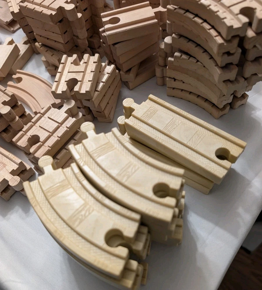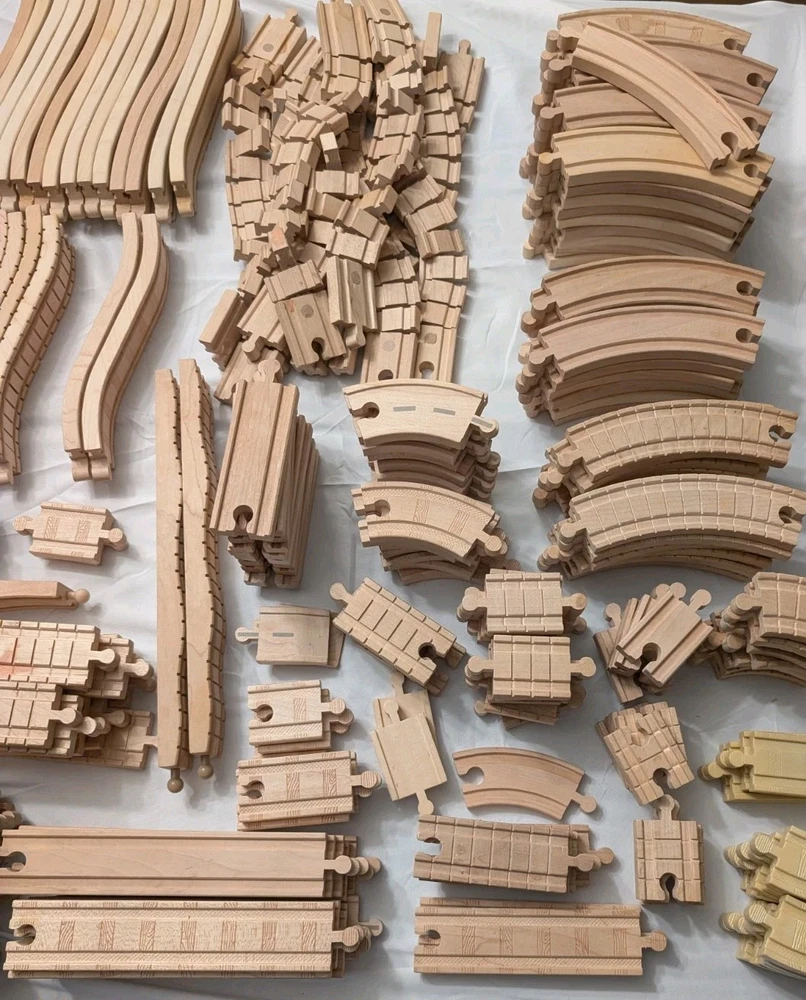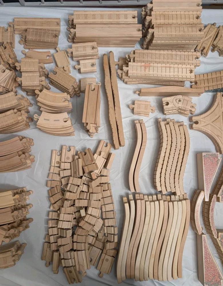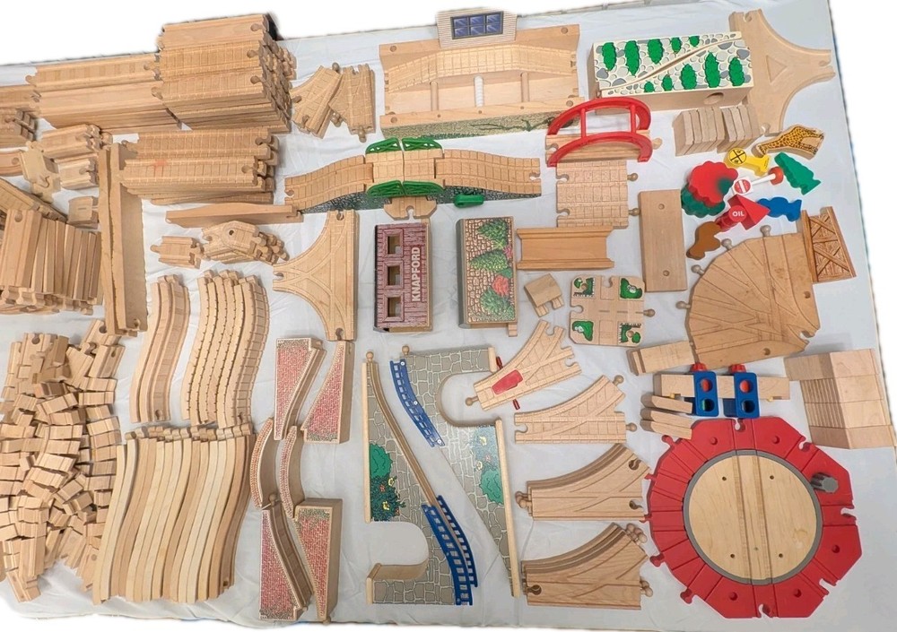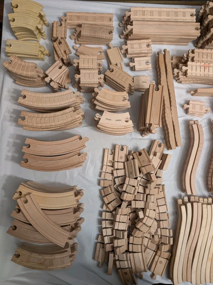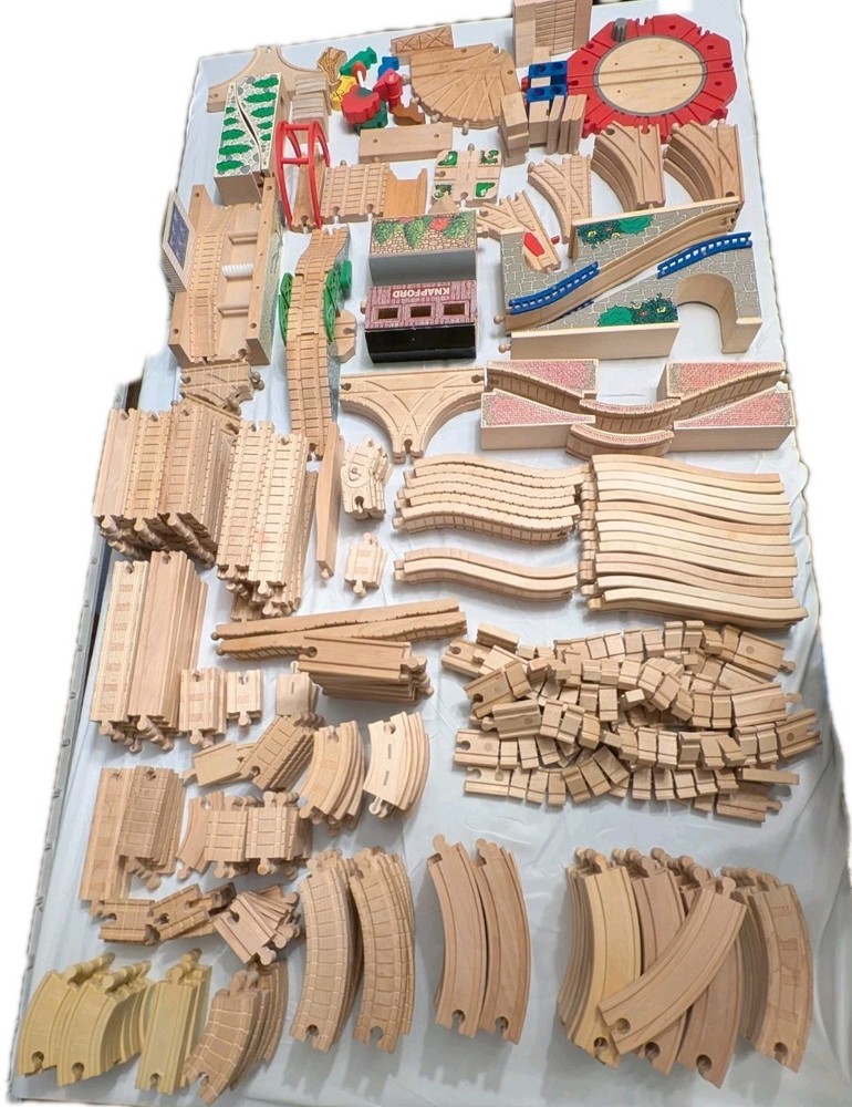 I counted 337 individual pieces. Train tracks come from a mixed set from late 90s to early 2000s. See photos for details! Some tracks double as roadways when flipped. 16 pieces are plastic, not wood. Lot weighs just under 50 pounds and is quite large so please keep in mind regarding shipping. Local pickup is also available.