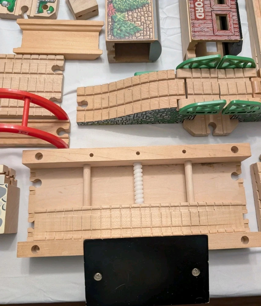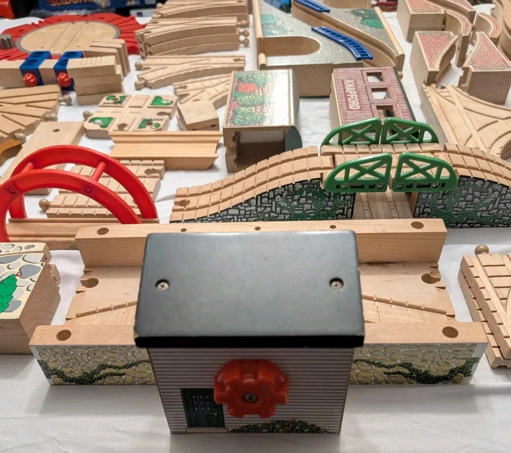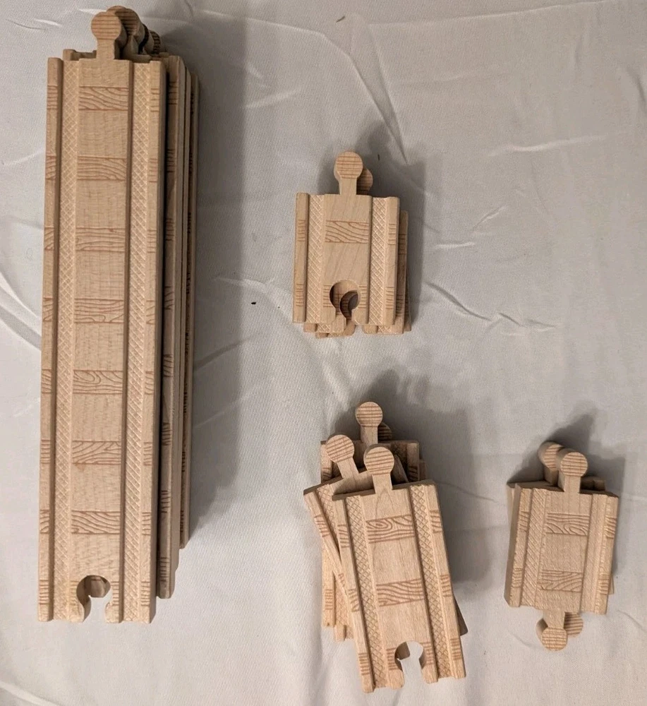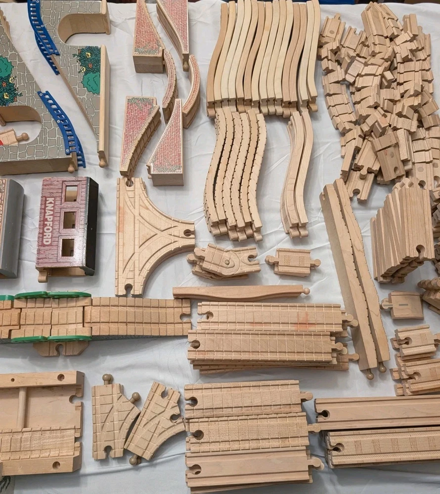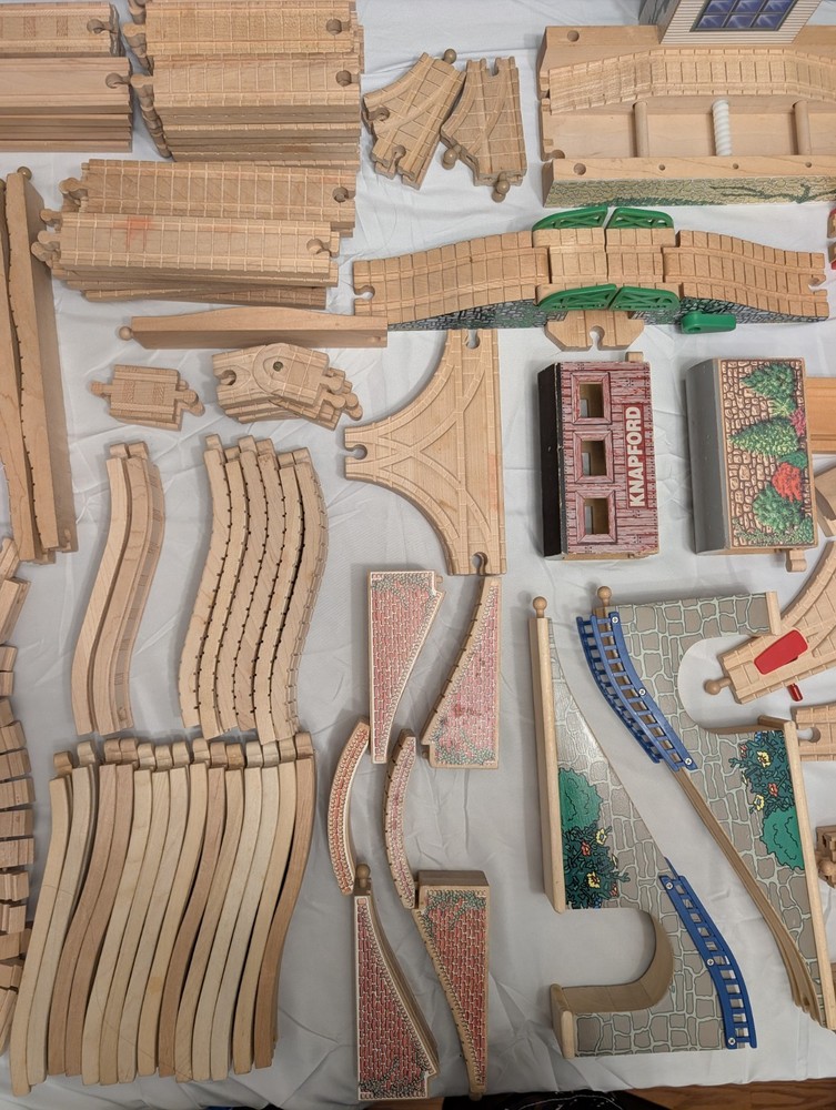 I counted 337 individual pieces. Train tracks come from a mixed set from late 90s to early 2000s. See photos for details! Some tracks double as roadways when flipped. 16 pieces are plastic, not wood. Lot weighs just under 50 pounds and is quite large so please keep in mind regarding shipping. Local pickup is also available.