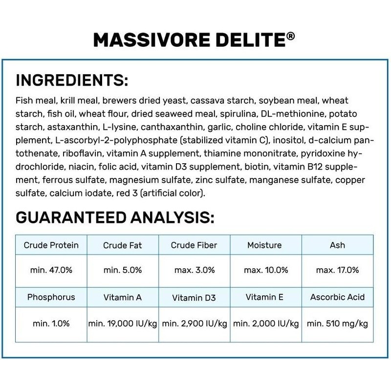 You may also like Wheat Germ Fish Food Sticks Winter Transition Digestibility Low Temp Feeding New 16.57 USD 17.44 USD Free shipping 5% off Koi Fish Food Floating Pellets High Protein Nutritional Diet Immunity Booster US 31.74 USD 33.41 USD Free shipping 5% off Flaked Fish Food Koi Goldfish Nutrient Rich Clear Water Formula Enhances Color 9.67 USD 10.18 USD Free shipping 5% off Koi Pond Food Floating Sticks Cold Weather Nutrition Wheat Germ Clear Water New 16.57 USD 17.44 USD Free shipping 5% off Premium Pond Food Sticks Koi Goldfish All Life Stages Clear Water Nutrition New 18.8 USD 19.79 USD Free shipping 5% off High Protein Floating Fish Food Koi Goldfish All Seasons 35% Granules 10lb New 35.45 USD 37.32 USD Free shipping 5% off Floating Fish Food Pellets Immune Support Healthy Life Non Clouding 9oz Natural 15.86 USD 16.69 USD Free shipping 5% off High Carotenoids Fish Food Sticks Immune Support Top Feeding Carnivores New 36.8 USD 38.74 USD Free shipping 5% off Floating Fish Pellets Healthy Cichlid Tropical Fish Immune Support Food New 15.28 USD 16.08 USD Free shipping 5% off Protein-Rich Marine Fish Food Pellets Shrimp Meal Immune Support All Life Stages 13.22 USD 13.92 USD Free shipping 5% off Cichlid Fish Food Protein Flakes Daily Nutrition Immune Support Clear Water New 11.29 USD 11.88 USD Free shipping 5% off Floating Fish Food Pellets High Beta Carotene Promotes Healthy Fish Colors New 19.38 USD 20.4 USD Free shipping 5% off About this item Scientifically blended nutrient mix specifically for larger carnivorous fish Higher levels of carotenoids promote the development of brilliant colors Free of unwanted parasites and bacteria common hitchhikers in live foods Each pellet is the nutritional equivalent of 1. 8 live goldfish Stabilized vitamin C to support immune system health Massive Delight 2. 2lb Promotes healthy form. Helps reduce fish waste High in stabilized vitamin c to reduce stress and build immunity to disease Massivore Delite 2. 2lb Promotes healthy form. Helps reduce fish waste Brand: Flavor: Fish Age Range (Description): All Life Stages Item Form: Bag Specific Uses For Product: Fish Food You may also like Versatile Folding Camping Chair W/ Cooler Bag & Side Table Outdoor Comfort New 97.32 USD 102.44 USD 5.99 USD 5% off Versatile Adjustable Bookcase Home Office Storage Collectibles Display Shelf New 116.19 USD 5.99 USD 5 Piece Fireplace Tool Set Wrought Iron Fire Tools Ash Brush Shovel Tongs New 57.75 USD 5.99 USD Durable Weather-Resistant Mailbox Easy Assembly Large Capacity Secure Door New 81.42 USD 5.99 USD Waterproof Bicycle Pannier Bag Large Capacity Easy Install W/ Shoulder Strap New 44.0 USD 5.99 USD 1000W Professional Blender 72oz Pitcher Total Crushing Recipe Guide Ice Snow New 94.0 USD 5.99 USD Kids Toy Storage Bookshelf W/ Open Shelves & Spacious Cubby Bins Organizer New 79.01 USD 5.99 USD Deep Inflatable Pool Kids & Adults Large Round Splash Water Fun Activity New 65.25 USD 5.99 USD Aluminum Tripod 360° V-Yoke Adjustable Monopod Lightweight Stable Shooting New 14.39 USD 5.99 USD Handheld Showerhead W/ Magnetic Base Flexible Hose Multiple Spray Settings New 70.85 USD 5.99 USD Compact 0.7 Cu Ft Microwave Oven Easy Touch Presets Defrost Timer Turntable New 82.26 USD 5.99 USD Compact 0.7 Cu Ft Microwave Oven W/ Touch Presets & Rotating Turntable New 82.26 USD 5.99 USD
