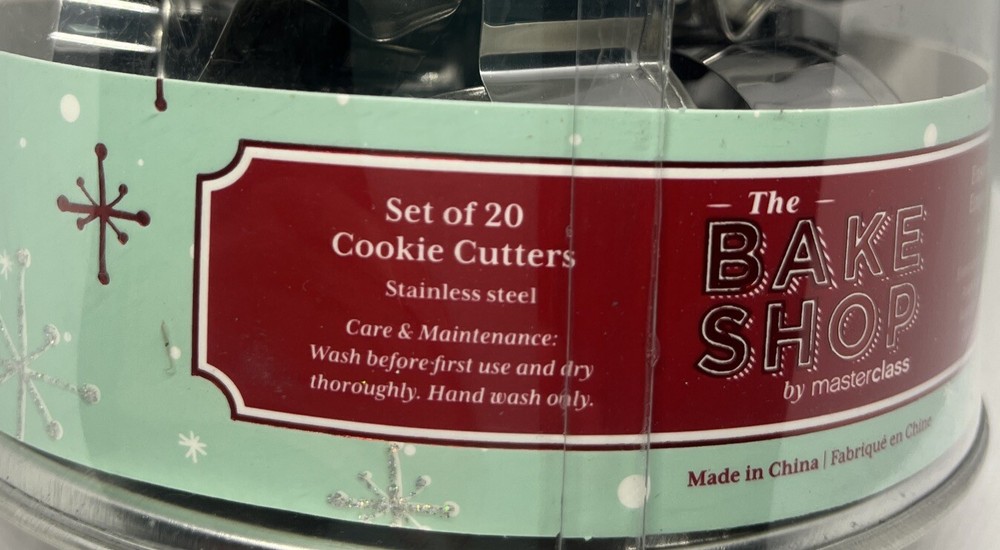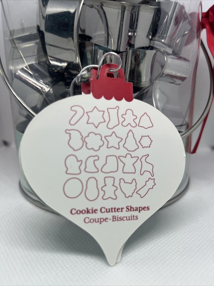 NEW-Factory Sealed in Plastic Bucket FREE SHIPPING Ready to gift - includes gift tag 20 Christmas Themed Cookie Cutters Stainless Steel 20 Various Shapes - see pics for exact shapes included 3” x 3” Cookie Cutter Size (1” deep)