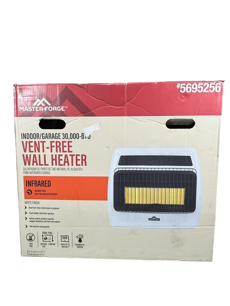 Stay warm and cozy with the Master Forge Indoor Outdoor 30000 BTU Vent Free Wall Heater. This powerful heater is perfect for heating garages, workshops, basements, and other indoor or outdoor spaces. Key Features: Powerful 30000 BTU Heating: Provides efficient and effective heat. Vent-Free Design: No need for venting, easy to install. Durable Construction: Built to last with high-quality materials. Thermostat Control: Precise temperature control for optimal comfort. Safety Features: Equipped with safety features for peace of mind.