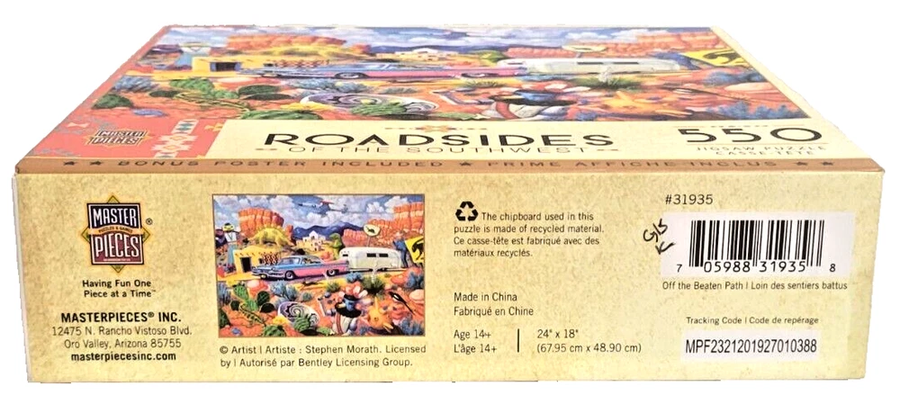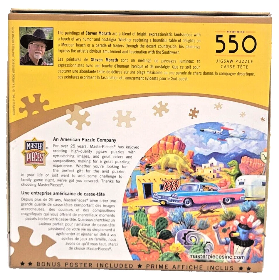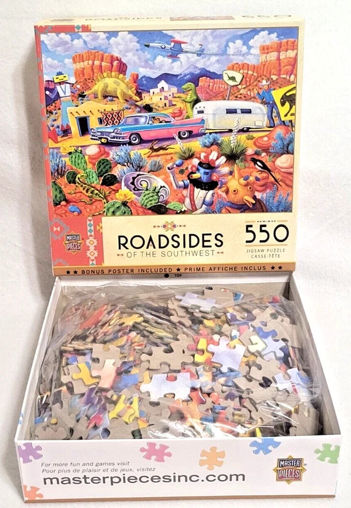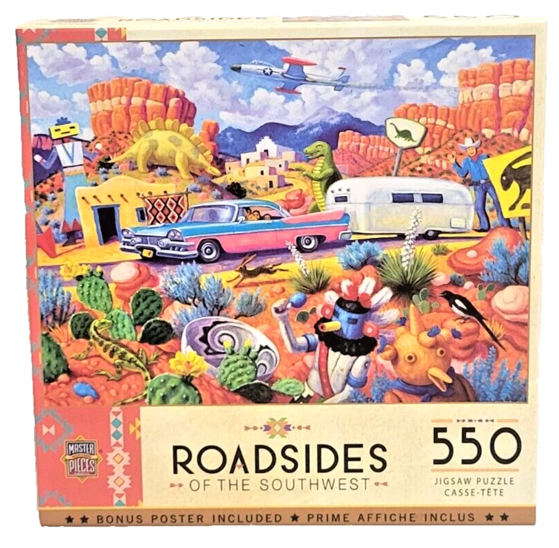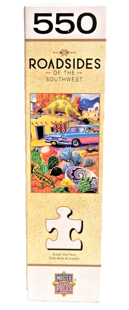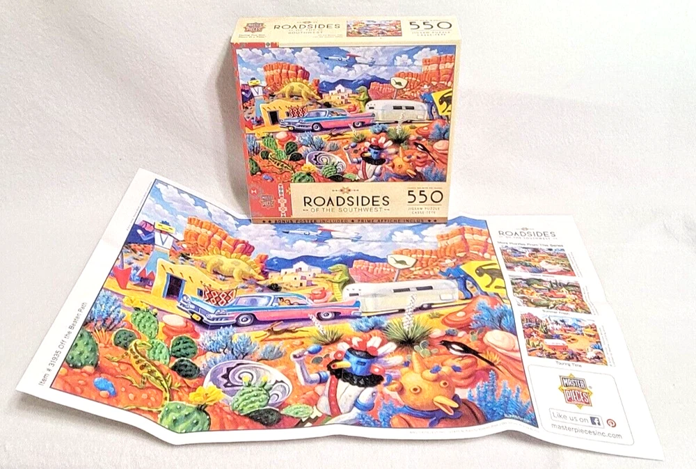 Immerse yourself in the beauty of the American Southwest with this fun 550-piece puzzle from MasterPieces. The artwork, created by Stephen Morath, depicts a whimsical collection of roadsidelocations in the region. The puzzle measures 24" x 18" when completed and is made from high-quality cardboard materials. Featuring a multi-color landscape theme, this puzzle is perfect for puzzle enthusiasts of all ages. The puzzle is from a smoke-free household and comes with a reference poster for added convenience. Recommended for ages 14 and up, this puzzle is sure to provide hours of entertainment for anyone who loves the beauty of the American Southwest. Doing puzzles has some hidden benefits . Excellent qualities : Cultivate concentration, patience, and temper your will Movement development : Train hand-eye coordination and precise small movements Spatial intelligence : Improve visual discrimination of colors and shapes Critical thinking ability : Understand the relationship between parts and the whole, and draw inferences from one example to explore the future Relaxes your mind : Relieve work pressure and release yourself Brain development : Enhance memory and may help prevent or slow brain degeneration We did not work the puzzle or count the pieces, but we verify the number count at your request. Each item we ship is carefully packaged to prevent any damage and is shipped immediately with tracking.
