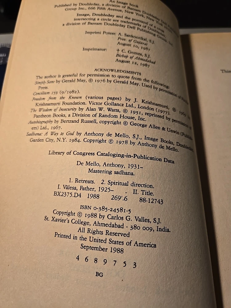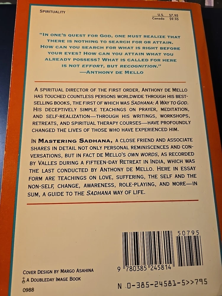 This book is a valuable resource for those interested in self-help, body, mind, and spirit, as well as religion and philosophy. It provides guidance on mindfulness and meditation, personal growth, and comparative religion, with a focus on Eastern traditions. The author, Carlos G. Valles, has created a comprehensive guide that includes 192 pages of insightful content. The book is available in trade paperback format and has dimensions of 8.5 inches in length, 5.7 inches in width, and 0.5 inches in height. It weighs 8.4 ounces and is published by Crown Publishing Group, T.H.E. The book title is "Mastering Sadhana: On Retreat with Anthony De Mello" and it was published in 1988. This item is perfect for those looking to expand their knowledge and understanding of spirituality and personal growth.