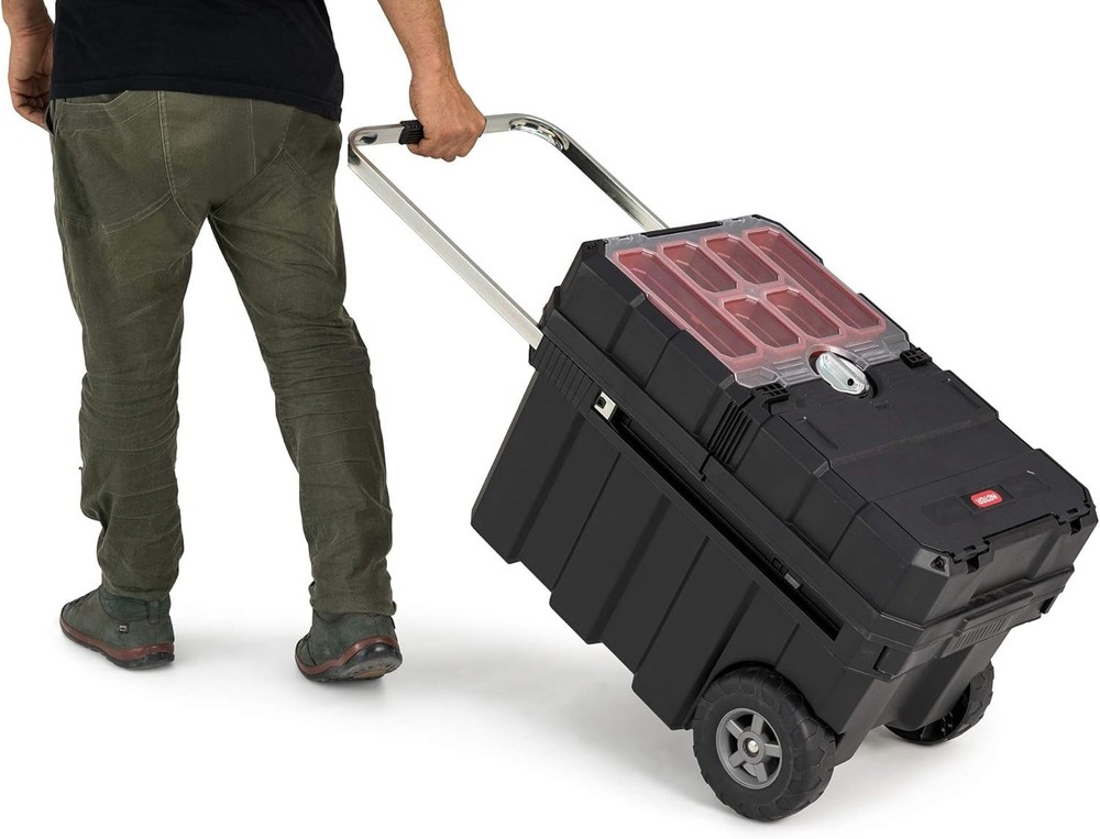 1. This rolling tool box is a game-changer for keeping tools organized and secure! The sturdy all-weather resin construction holds up to heavy use, and the smooth-rolling wheels make transport effortless. Love the central locking system—it keeps everything in place while moving and adds extra security. Perfect size for storing all my essentials without taking up too much space. Highly recommend for anyone needing a durable, mobile toolbox!