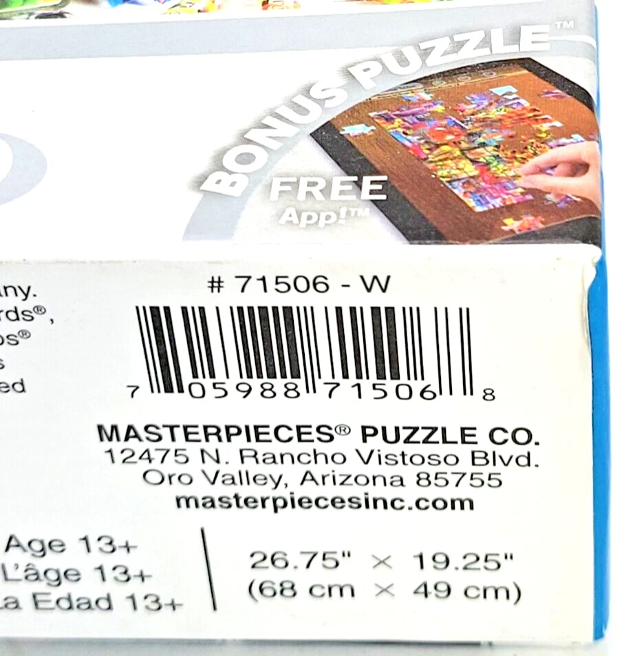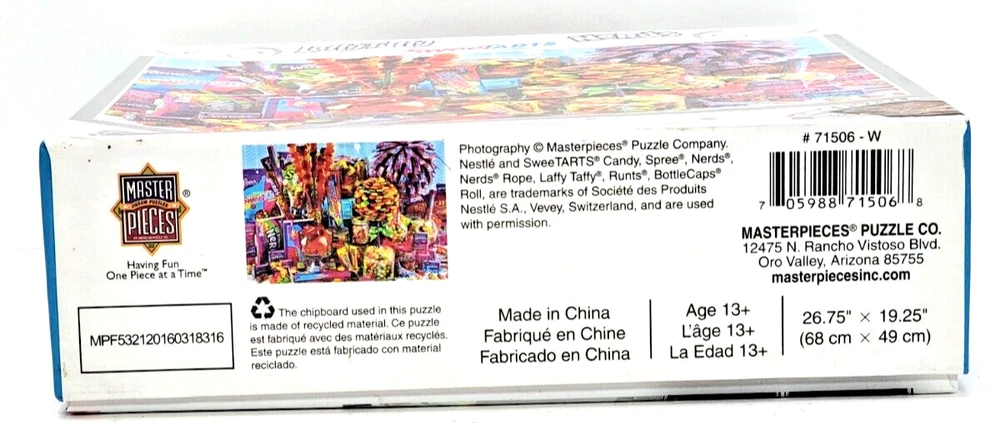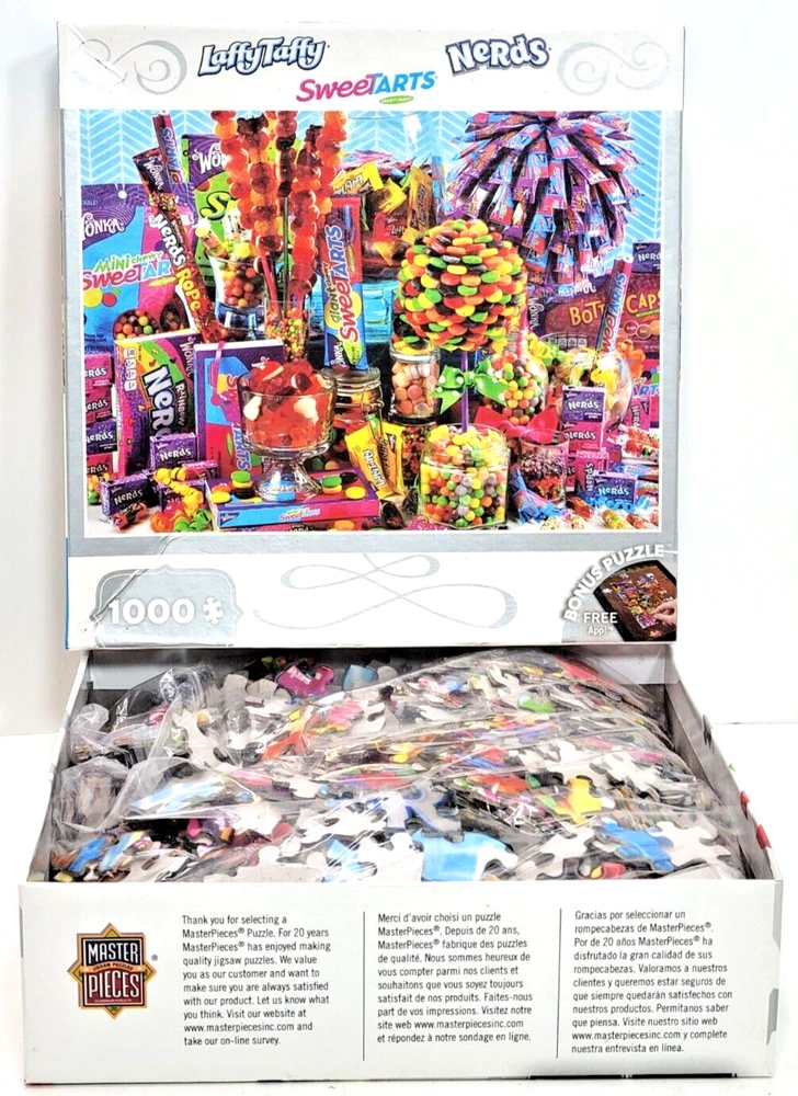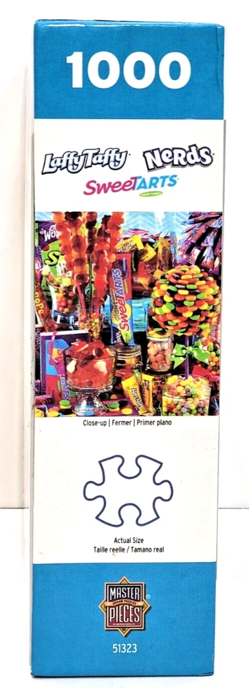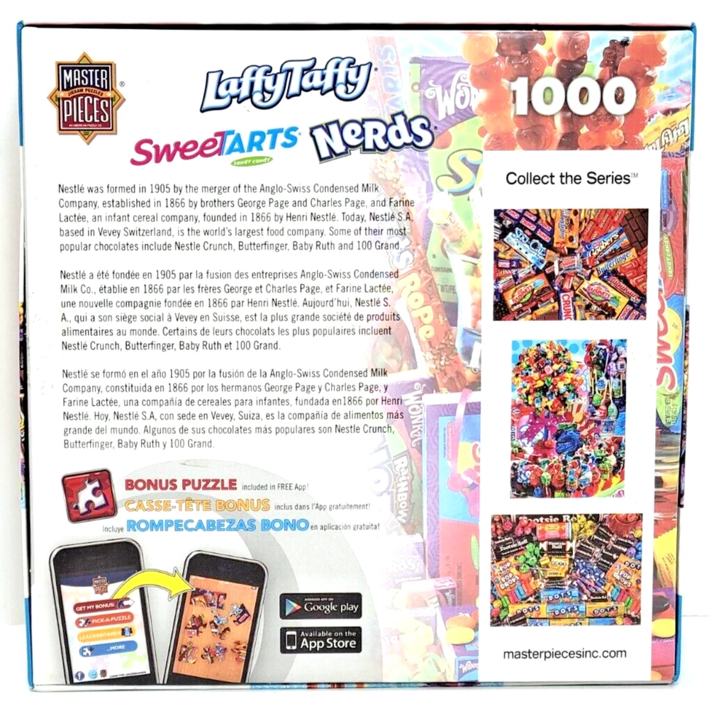 This 1000-piece jigsaw puzzle features colorful candies from Nestle arranged in a vibrant and inviting manner. The puzzle measures 26.5 inches by 19.25 inches when completed and is suitable for ages 8 and up. The puzzle is from MasterPieces, known for its high-quality puzzles. As you put together this puzzle, you'll discover the intricate details of each candy and how they fit together to create a delicious scene. This puzzle is a great way to spend time with family or friends and makes for a fun and challenging activity. Whether you're a puzzle enthusiast or a candy lover, this puzzle is sure to delight. We did not work the puzzle or count the pieces, but we verify the number count at your request. Each item we ship is carefully packaged to prevent any damage and is shipped immediately with tracking.