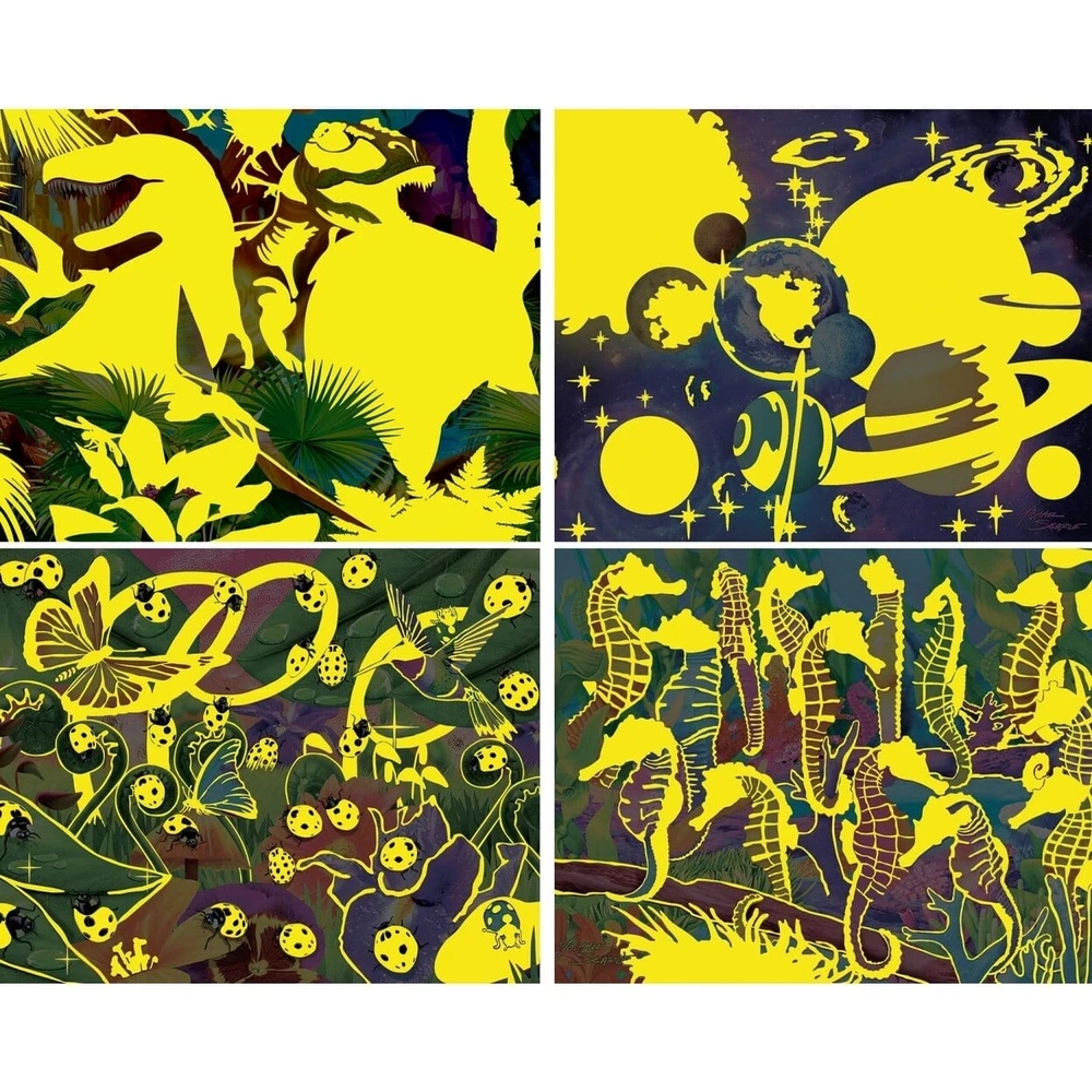 The MasterPieces Glow in the Dark (Blue) 4 Pack - 100 Piece Kids Jigsaw Puzzle will spark your childs imagination. This captivating set features four 8" x 10" glow-in-the-dark puzzles. Created by the renowned artist Michael Searle, each puzzle features a unique theme - seahorses, dinosaurs, the solar system, and a tangle of ladybugs. Designed for children aged 6 and up, these puzzles are not only brightly colored but also glow in the dark, adding an extra touch of magic to the playtime experience. Michael Alan Searle, a talented illustrator, and designer with a successful career spanning 25 years, has poured his creativity into these captivating puzzles. Masterpieces Glow In The Dark Jigsaw Puzzles 100 Piece 4 Pack Kids V2 The MasterPieces Glow in the Dark (Blue) 4 Pack - 100 Piece Kids Jigsaw Puzzle will spark your childs imagination. This captivating set features four 8" x 10" glow-in-the-dark puzzles. Created by the renowned artist Michael Searle, each puzzle features a unique theme - seahorses, dinosaurs, the solar system, and a tangle of ladybugs. Designed for children aged 6 and up, these puzzles are not only brightly colored but also glow in the dark, adding an extra touch of magic to the playtime experience. Michael Alan Searle, a talented illustrator, and designer with a successful career spanning 25 years, has poured his creativity into these captivating puzzles. Product Attributes: Weight (lbs.) : 0.75 lb UPC: 705988120251 Brand: MasterPieces