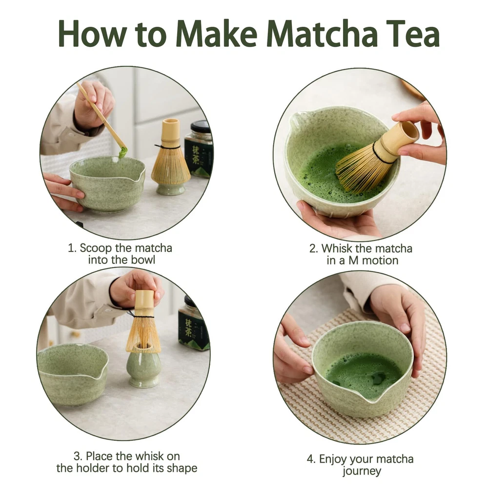 [Design Concept]: This matcha kits draws inspiration from the beauty of nature, with glaze colors complementing the tones of matcha, presenting a vibrant and elegant appearance. Each ceramic chawan is a unique piece of art, as if infused with the fresh greenery of the outdoors. Beyond adding an artistic touch to your matcha moments, it seamlessly integrates into modern life, becoming a part of your refined taste. Choosing this tea ceremony set enhances your tea time with an aura of elegance and uniqueness. [Exclusive Matcha Ceremony Collection]: Our 4-piece set includes essential tools for an authentic matcha experience: 1* Whisk, 1* Scoop, 1* Ceramic Bowl (Chawan) 500 ml/17 oz, and 1* Ceramic Whisk Holder. Crafted with precision, this ceramic matcha set is designed to make embracing matcha as a lifestyle effortlessly stylish. Elevate your tea ritual with our thoughtfully curated collection, perfect for both enthusiasts and newcomers to the world of matcha. [Thoughtful Spout Design]: Our ceramic matcha bowl features a convenient spout design, ensuring a smoother and more controlled pour every time. The thoughtful spout not only adds a touch of elegance to your matcha preparation but also eliminates any risk of unnecessary spills or mess, providing you with a delightful and clean matcha experience. [Glazed Interior for Easy Cleaning]: Our tea bowl's interior is glazed, not only enhancing its aesthetics but also making it easier to clean. This lead-free glazing ensures safety while preventing tea residue from lingering, ensuring a pristine and safe experience. [Exceptional Quality Whisk and Scoop]: Our whisk is meticulously designed and handcrafted with about 76 fine tines, ensuring optimal agitation. Its unique shape guarantees the best stirring, blending, and frothing, creating a tea experience infused with the essence of artistry and craftsmanship. Paired with our equally exquisite tea scoop, it brings an unparalleled tea-drinking experience to you.