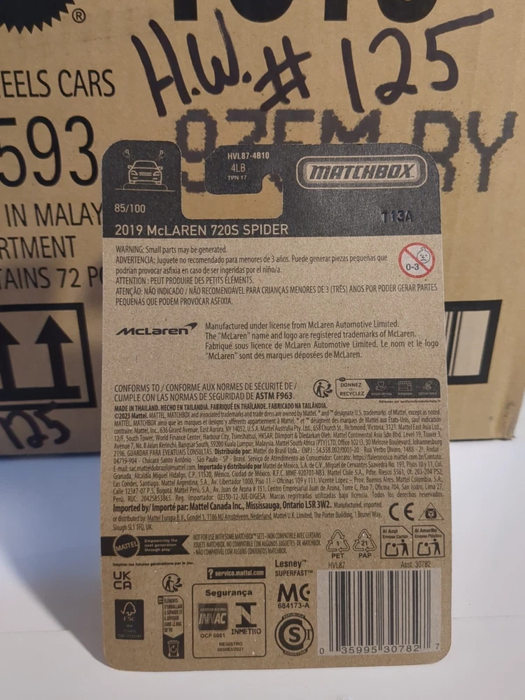 For the car enthusiasts out there, this Matchbox diecast model of a 2019 McLaren 720S Spider in metallic purple is a must-have addition to your collection. This unopened box features a 1:64 scale model of the vehicle, with intricate details that make it stand out. The brand Matchbox is known for its quality and this model is no exception, with its durable material and attention to detail. This mixed type model is perfect for display or play, and is suitable for all ages. The vehicle make and model are McLaren 720S Spider and the year of manufacture is 2024. This item falls under the categories of Toys & Hobbies, Diecast & Toy Vehicles, and Cars, Trucks & Vans. Get your hands on this limited edition model today! See pics for condition