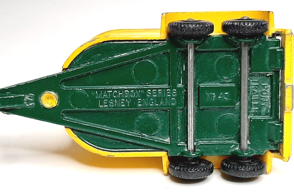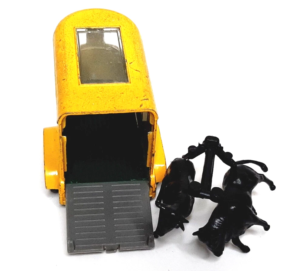 Country/Region of Manufacture: United Kingdom Series: Matchbox Brand: Matchbox Material: Diecast Seller Notes: “Great condition with only minimal finish wear; comes with two cows, but no horses” Scale: 1:64 gtin13: Does not apply Model: Lesney Matchbox # 43 Color: Yellow Gender: Boys & Girls UPC: Does not apply Vehicle Type: Trailer