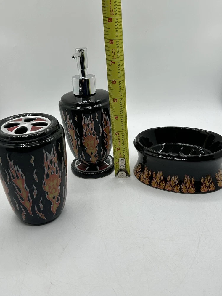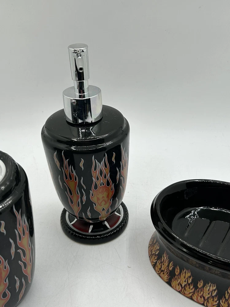 Originally purchased for a friend doing a Harley themed bathroom. Please note the dispenser has a crack on plastic around the cap (shown in last photo) but does not affect functionality.