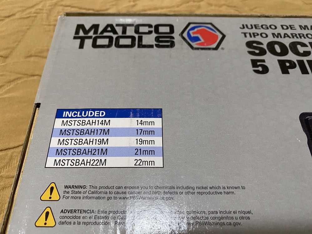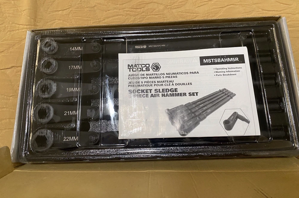 The Matco Tools Socket Sledge 5 Piece Air Hammer Set includes impact sockets in metric sizes ranging from 14mm to 22mm. This set is designed for use with air hammers and is ideal for automotive and industrial applications. With a durable construction and no warranty, this set is perfect for professionals looking to add high-quality tools to their toolbox. The manufacturer part number ensures easy identification and compatibility with Matco Tools products.
