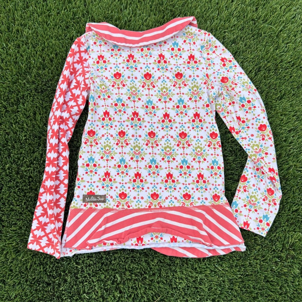 Matilda Jane long sleeve top showcases a vibrant mixed print design with floral, geometric, and striped patterns in red, blue, and white. This whimsical piece features a unique asymmetrical fold-over collar accented with two decorative buttons and a tiered ruffle hem for a playful, boutique aesthetic. Crafted from a soft cotton-spandex blend, it offers a comfortable stretch fit perfect for everyday wear or special occasions. Brand: Matilda Jane Style: Mixed Print Tunic Material: 95% Cotton, 5% Spandex Neckline: Asymmetrical Collar Sleeve: Long Sleeve Pattern: Floral, Striped, Geometric Hem: Ruffle Color: Red, White, Blue Closure: Pullover Accents: Buttons Keywords: Boutique, Shabby Chic, Whimsical, Cottagecore, Mixed Media, Playwear, Colorful, Pattern Play, Girly, Spring, Fall, School Outfit, Designer Kids Item is preowned, effort has been made to ensure all flaws are displayed photos serve as additional description Sizing varies by manufacturer and time period, please see measurements.