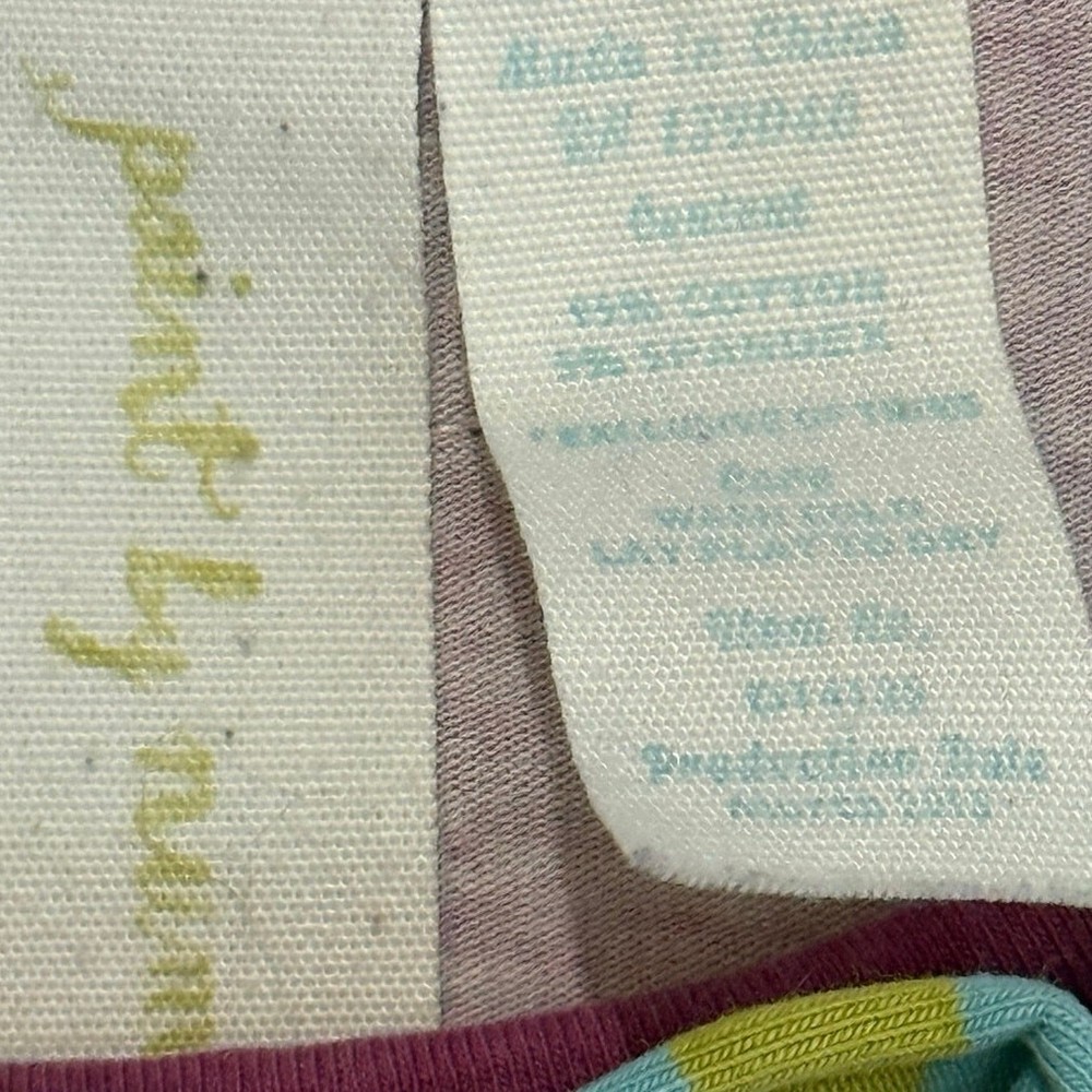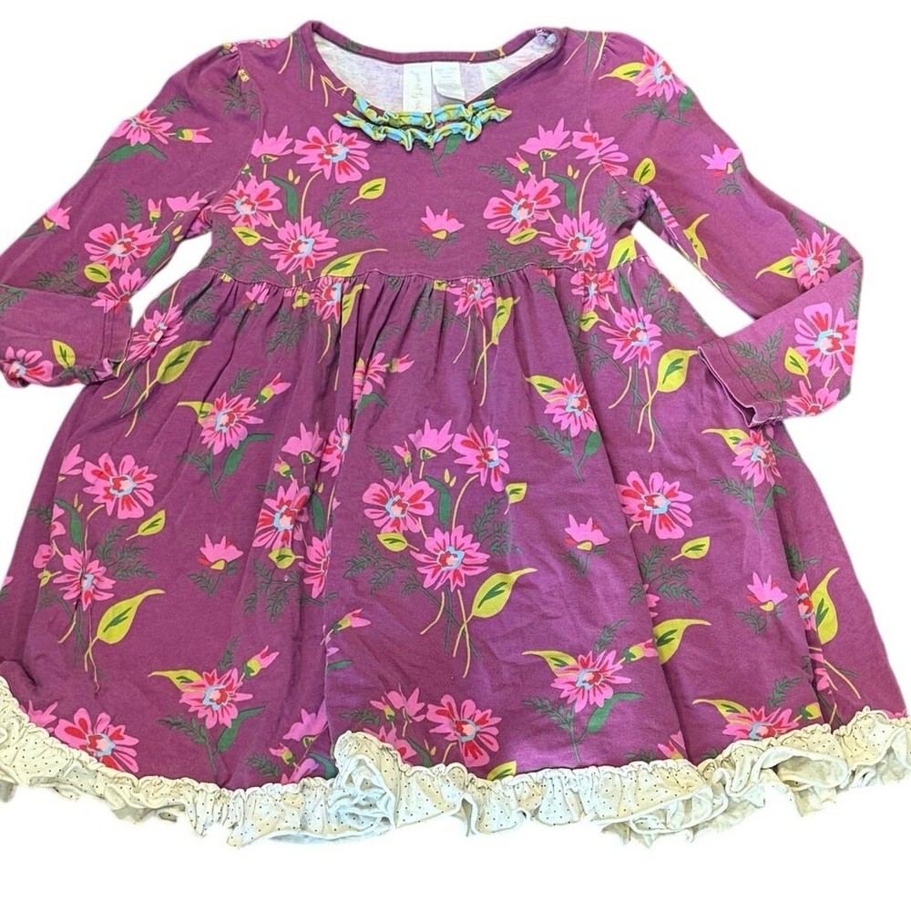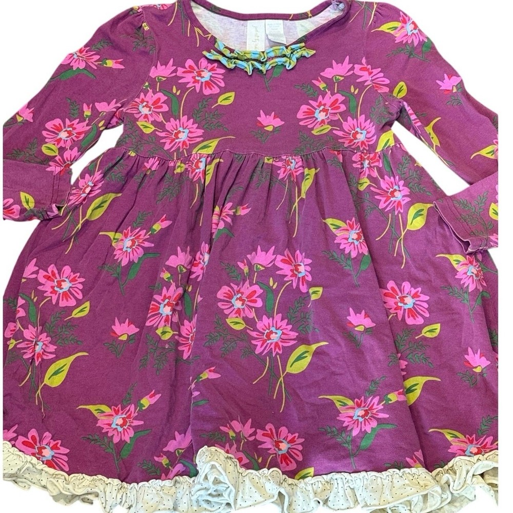 Adorable and classic Matilda Jane “Blossom Lap Dress” from the Paint by Numbers Fall 2013 collection. Features a rich plum background with bright floral print in pink and lime green, accented by a ruffled aqua-and-chartreuse neckline and cream polka-dot hem trim. Size: 6 Condition: Good used condition — normal wash wear consistent with age, no holes or stains noted. Please note this is from 2013, not a new dress. Fabric: 95% cotton, 5% spandex (soft knit stretch) Care: Machine wash cold, line dry Details: Long sleeve, swingy A-line silhouette, ruffle trim, floral print From the Paint by Numbers collection — a beloved, hard-to-find classic!