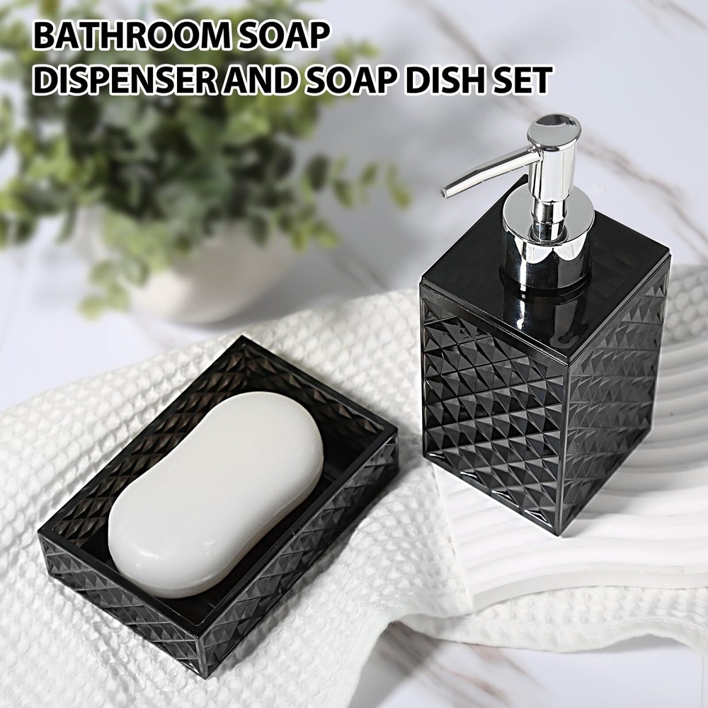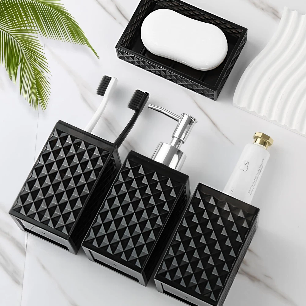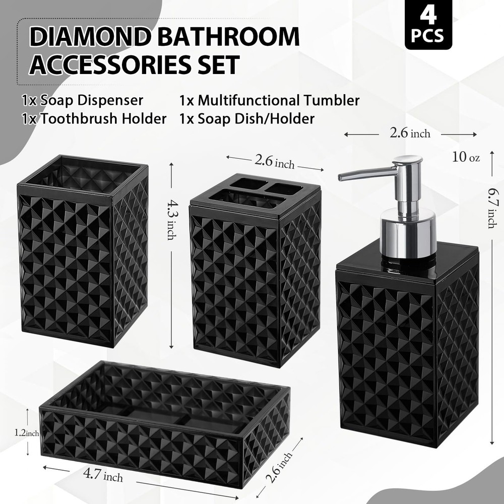 RYTOXILO Black Bathroom Accessories Set, 4 Pack Matte Black Bath Accessory Sets Complete, Acrylic Soap Dispenser and Toothbrush Holder Set for Bathroom Counter Sink, Modern Bathroom Decor 【ATTRACTIVE 4 PACK BLACK BATHROOM ACCESSORIES】 Get these DIAMOND STYLE elegant additions to your bathroom right now! Let these black bathroom accessories sets brighten your bathroom nicely! This black bathroom accessory set is perfect for every bathroom theme no matter boho, modern, farmhouse, vintage, and western, you name it! You would get a SOAP DISPENSER, a TOOTHBRUSH HOLDER, a MULTIFUNCTIONAL TUMBLER, and a SOAP DISH in just ONE set! 【GORGEOUS DIAMOND PATTERN DESIGN】Diamond is a symbol of purity and magnificence. Such a diamond-style acrylic black bathroom set could be easily suitable for your bathroom themes. Brighten up your bathroom space in a way that’s as unique as you are. Each black bathroom accessories set is handcrafted by experts, and each diamond pattern on it is equally sparkling, not only in your bathroom but also in the eyes of every guest who enjoys it. 【HIGH QUALITY ACRYLIC MATERIAL】All these black bathroom accessories sets complete are made of high-quality BPA-free acrylic. Elegant, sturdy, and never get rusted. Not easy to be broken or tip over. Let this black bathroom soap dispenser and toothbrush holder set complement your bathroom vanity decor. 【PRACTICAL FOR USE】If you are a person who loves enjoying your life, you would find that this black bathroom set meets all your daily needs in your life. The 10oz black soap dispenser filled with hand soap/lotion/face wash could be used for a long time; The black toothbrush holder could hold multiple toothbrushes and toothpaste; The multifunctional tumbler could hold combs and shavers; And the soap dish helps you place your soap very well. Makes your bathroom look tidy and wonderful 【WONDERFUL GIFT IDEA & SUPERIOR QUALITY SERVICE】This black toothbrush holder set is great and unique for housewarming, wedding, birthday, Mother's Day, Thanksgiving Day for mom, sister, colleague, and friends. We provide 100% product quality guarantee, the fastest, and the best service to ensure your satisfaction. Please feel free to let us know if you have any questions. SHIPPING Domestic Buyers - We have confidence in our products, but if you are not fully satisfied please contact us within 30 days of purchase and you will get full refund. - We ship within 3 business days of payment, usually sooner - We offer FREE shipping on all orders! - We only ship to the lower 48 states, no APO/FPO addresses or PO Boxes allowed International buyers – please note: Import duties, taxes, and charges aren't included in the item price or postage cost. These charges are the buyer's responsibility. - Please check with your country's customs office to determine what these additional costs will be prior to bidding or buying. * Order Cancellation Policy ** You can return a product for up to 30 days from the date you purchased it. 1. The seller reserves the right to cancel the special case only due to eBay cancellation fee. 2. The decision of seller is the final. 3. The seller will respond to the cancellation request within 2 business days. Please wait for the result of cancellation. 4. In case the cancellation is not completed by some reasons, the buyer can follow the options below to get the refund. 4.1 The buyer can reject the item when it arrives. 4.2 The buyer can send the item back to the seller within 30 days If the buyer receives item (USA Shipment ONLY). The seller will provide the FREE return label to the buyer when the buyer opens " Return Item" case on eBay by using the reason as "Change my mind" ONLY. 5. When buyer has placed the order. The order will be processed and completed by automatic warehouse system within 5 minutes. In case that buyer sends the cancellation request after 5 minutes of placing the order, the request will be rejected. **Sending direct message to cancel the order is not allowed for every case.* Return Policy For the return case - If buyer would like to return the items for refund or replacement, please CONTACT SELLER to receive the free return label from seller. The refund or replacement will be processed with the tracking number of return label which is provided by seller only. The other ways of return which are not approved by seller will not be processed for the refund or replacement.